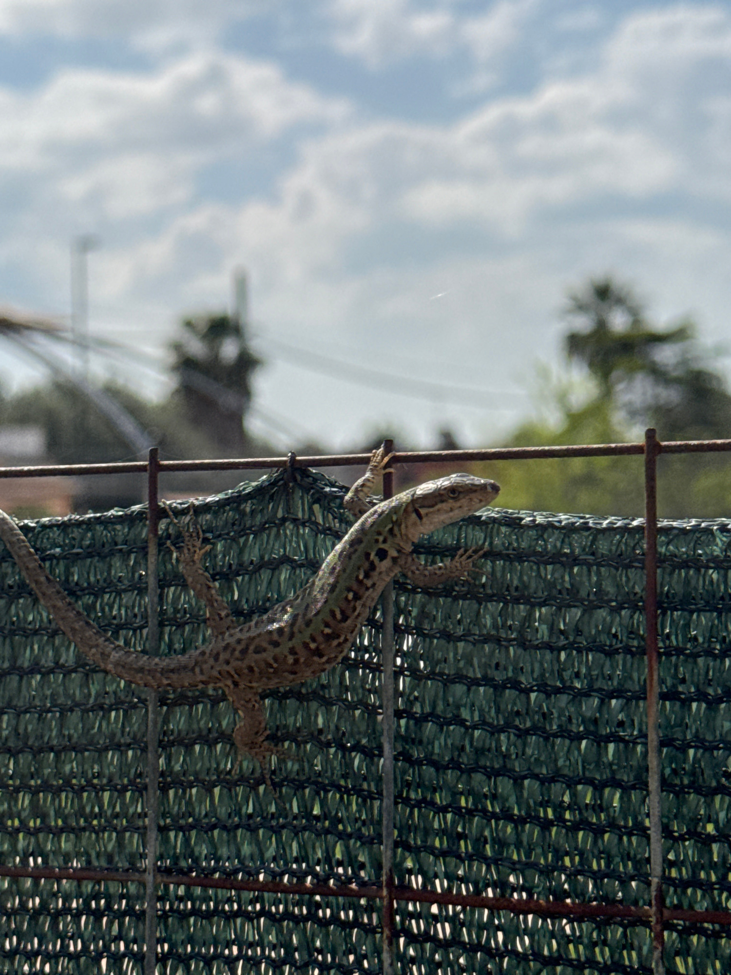 A close-up, portrait-oriented photograph (originally rotated 90 degrees counter-clockwise) features a lizard clinging to a dark green mesh net. The lizard, positioned vertically with its head pointing…read more