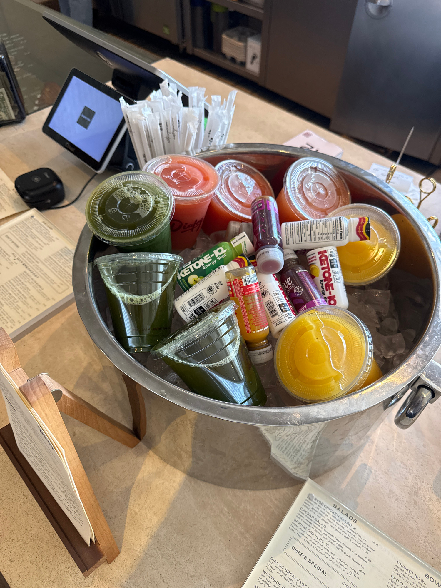 Here is a description of the image: **Scene**: The image shows a tabletop display of beverages and food options, likely at a restaurant or cafe. **Objects**: * A metal ice bucket containing an assor…read more
