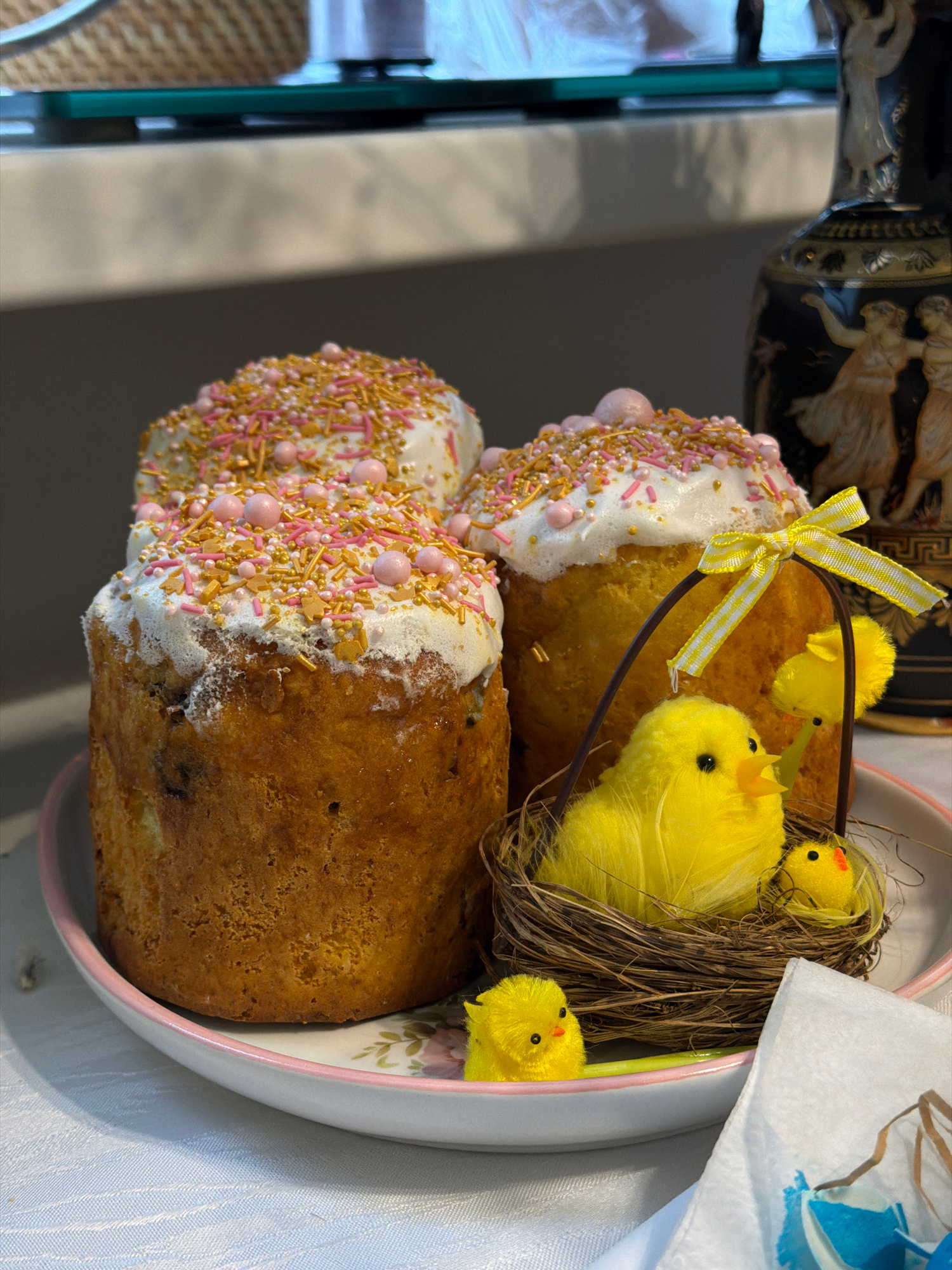 A tilted image depicts a two-tiered Easter bread decorated with white icing, pink and gold sprinkles, and small pink candies. A yellow-and-white checkered ribbon adorns the top tier. Three small, yell…read more