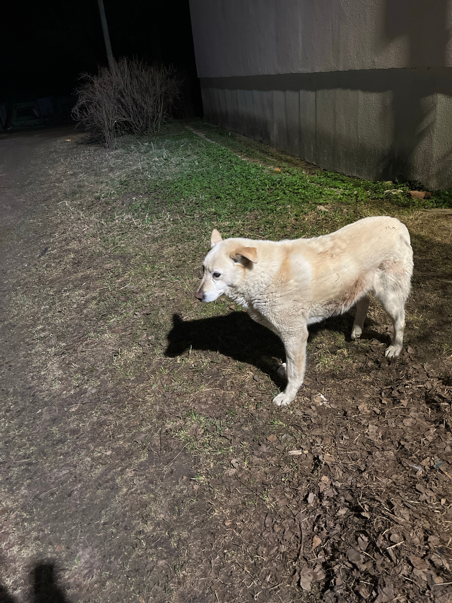 Razdolye, Russia. A medium-sized, light-colored dog stands on a mix of mud, grass, and dead leaves near a building illuminated by a light source. To the left is a small, leafless bush. The lighting ap…read more