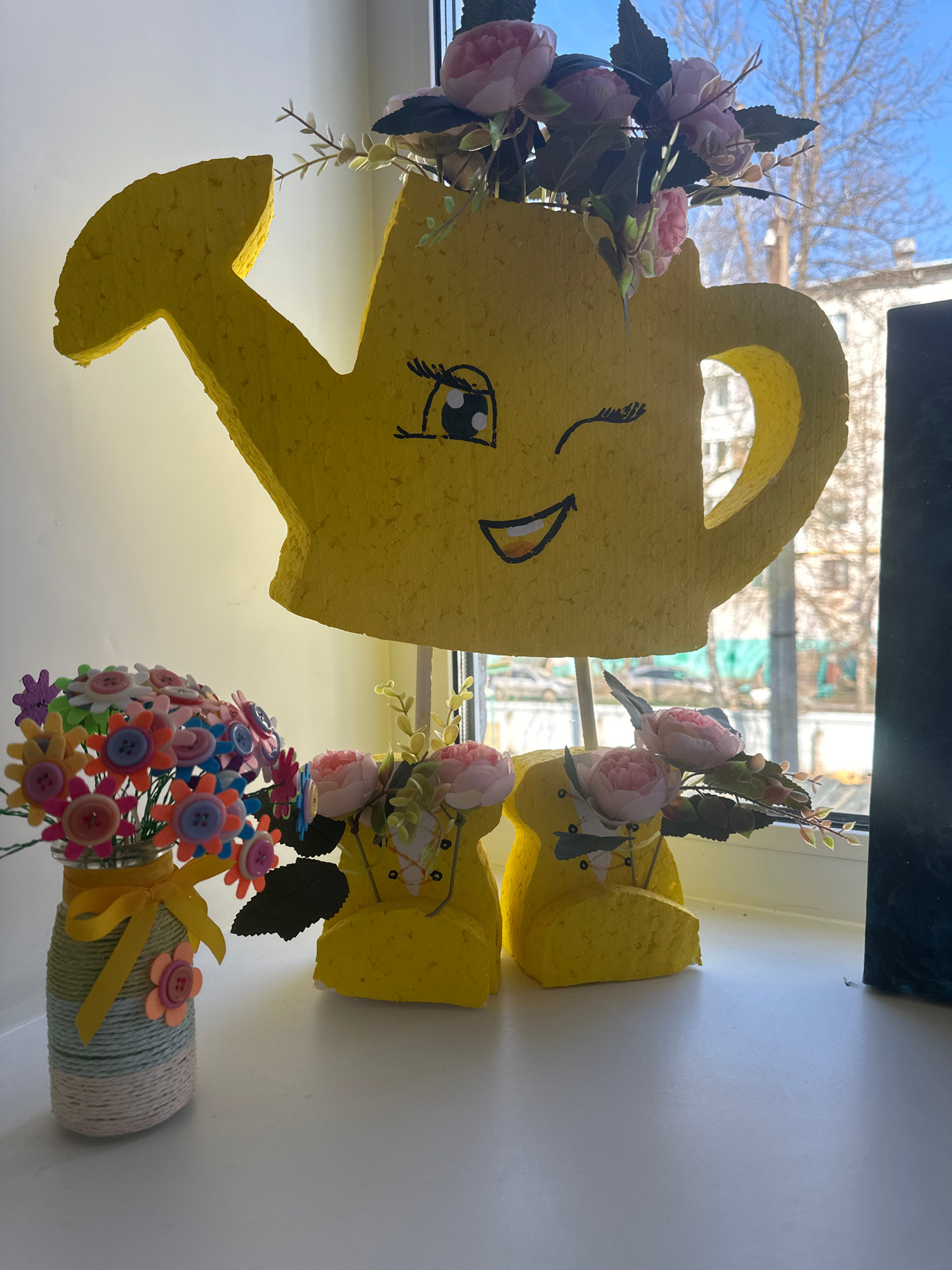 A yellow watering can shaped object with a face drawn on it is decorated with flowers. Two yellow boot shaped objects are also decorated with flowers. The boots are sitting on a window sill. A vase fi…read more