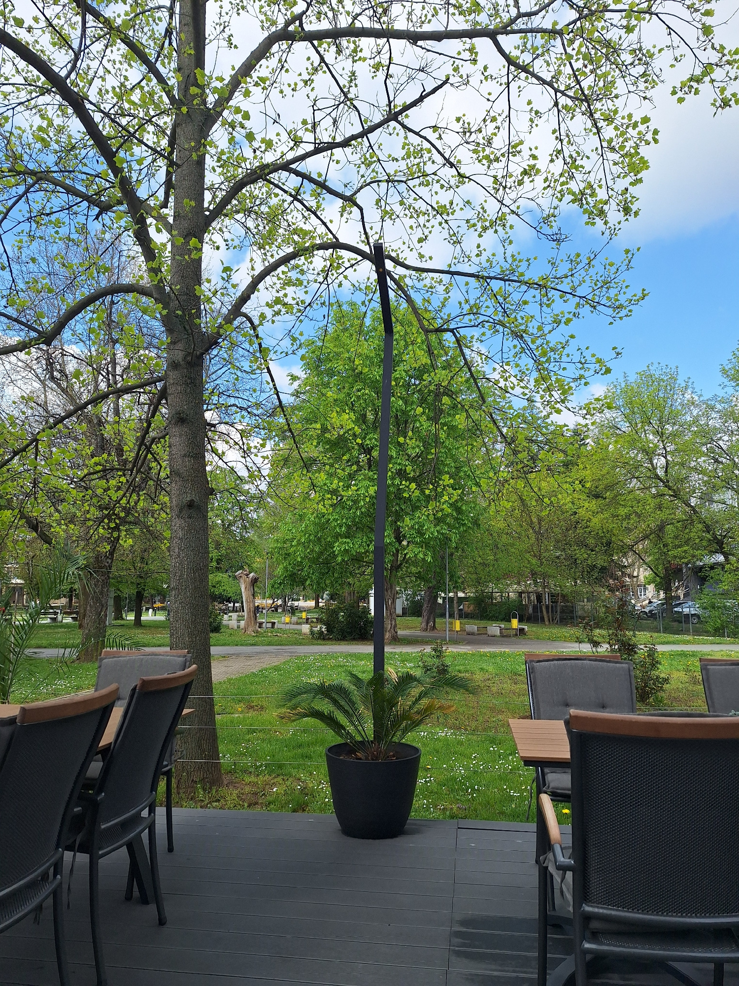 The image depicts an outdoor seating area, possibly a restaurant or cafe patio. The scene is dominated by trees; a large tree with emerging green leaves occupies much of the left side, while a green l…read more