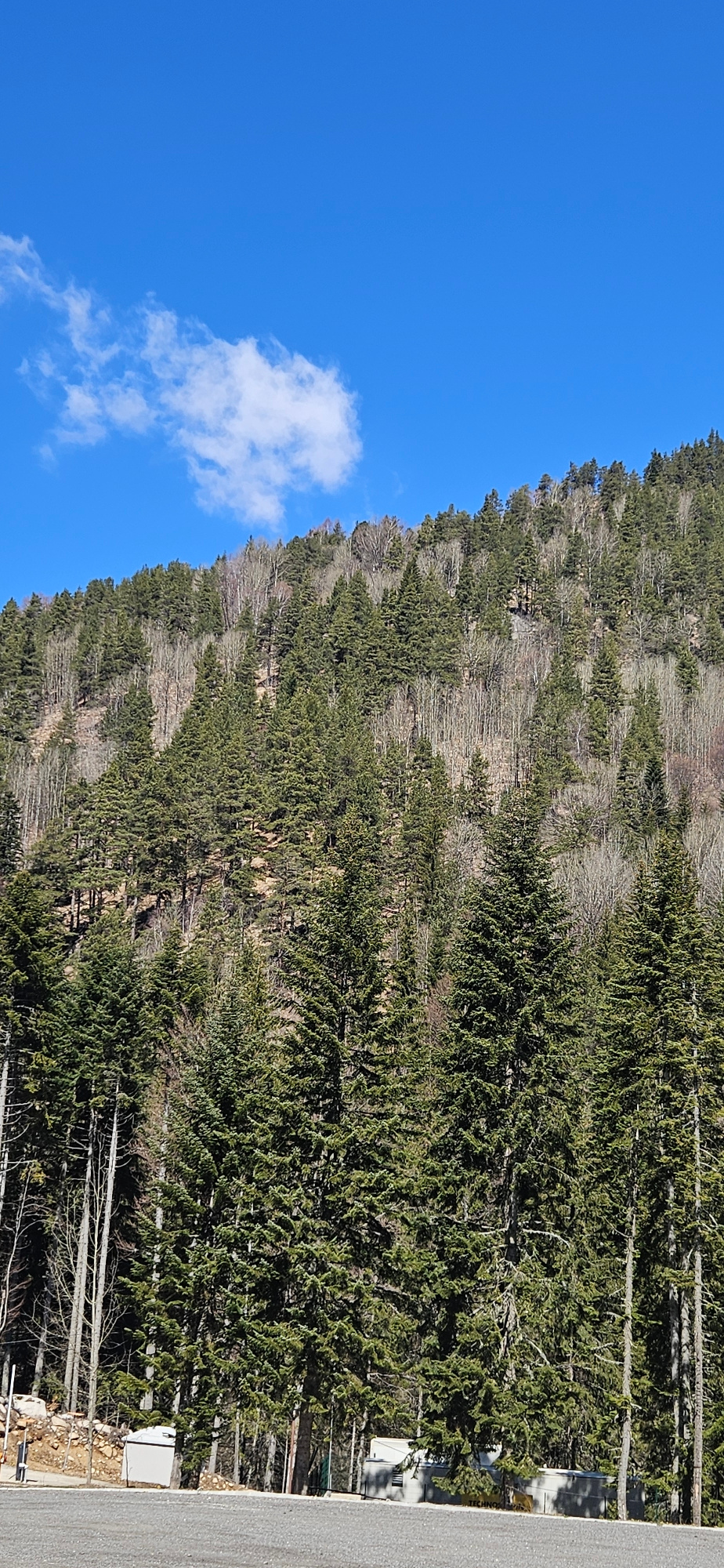 The image shows a forested hillside, likely in the city of Blagoevgrad, Bulgaria. Evergreen trees dominate the foreground and blend into deciduous trees farther up the slope. The sky is bright blue, w…read more