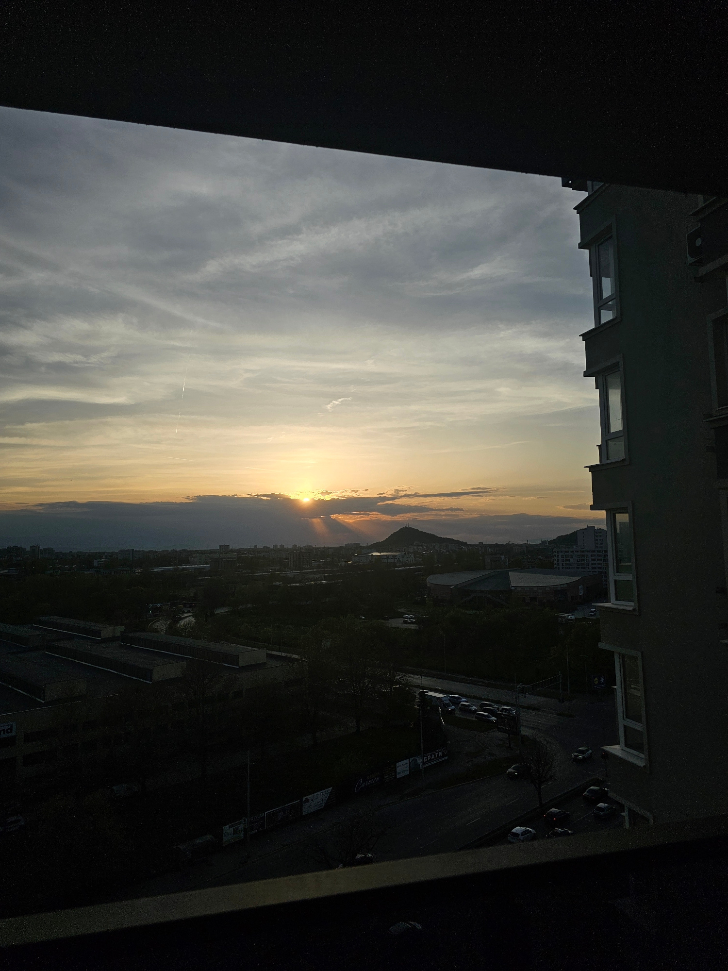 The image captures a sunset view from a high vantage point in Plovdiv, Bulgaria. The sky is filled with streaky clouds, transitioning from a soft grey to a bright golden hue around the setting sun. Be…read more