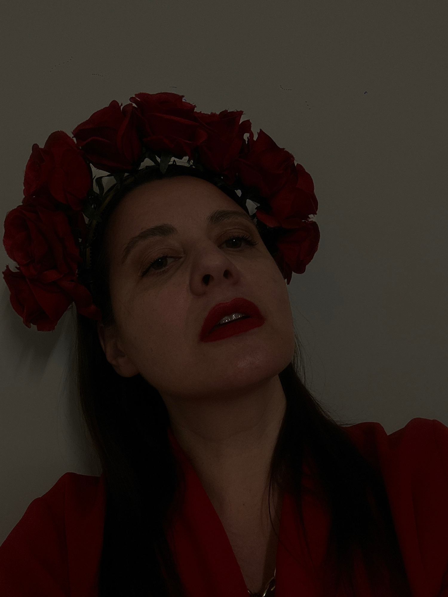 A woman wearing a crown of red roses and red lipstick looks up at the camera. She is wearing a red garment, and her dark hair is visible. The background is a muted grey. There is no information to sugβ¦read more