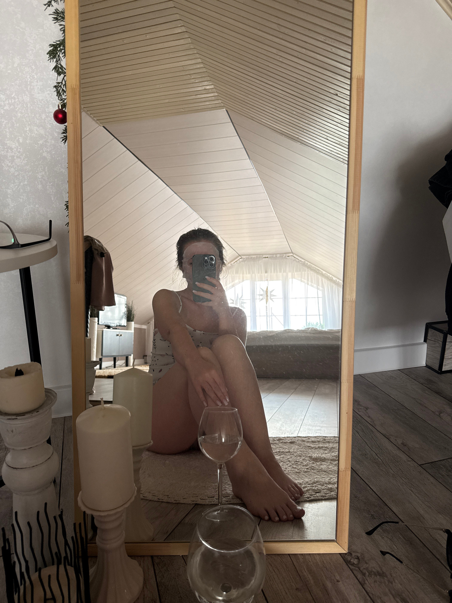The image shows a person reflected in a rectangular mirror with a light brown wooden frame. The mirror is positioned indoors, likely in a residential setting. The person in the reflection is holding a…read more