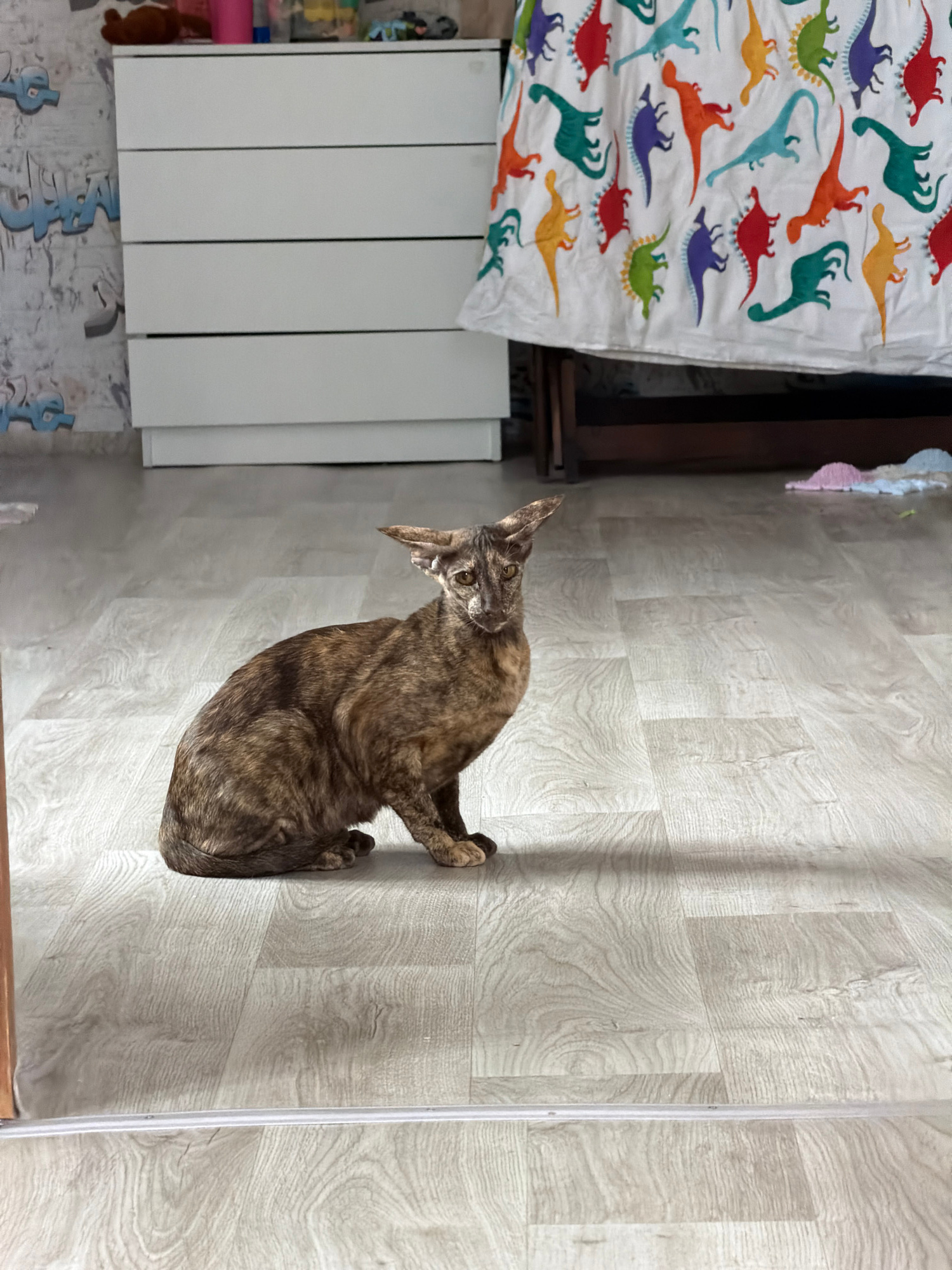A cat with dark brown and black brindle-like fur is sitting on a light gray floor with a wood grain pattern. A white radiator with vertical panels is visible to the cat's left. Further to the left isβ¦read more