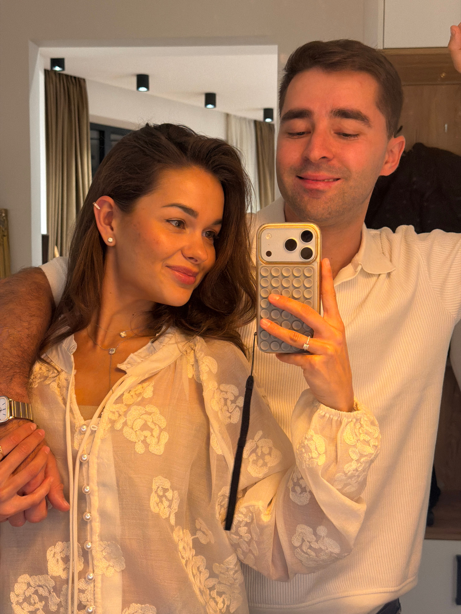 An indoor mirror selfie taken in Tbilisi, Georgia, depicts a man and a woman. The woman, positioned on the right, holds a silver/gold iPhone in a grey textured case with a grid pattern. She has dark h…read more
