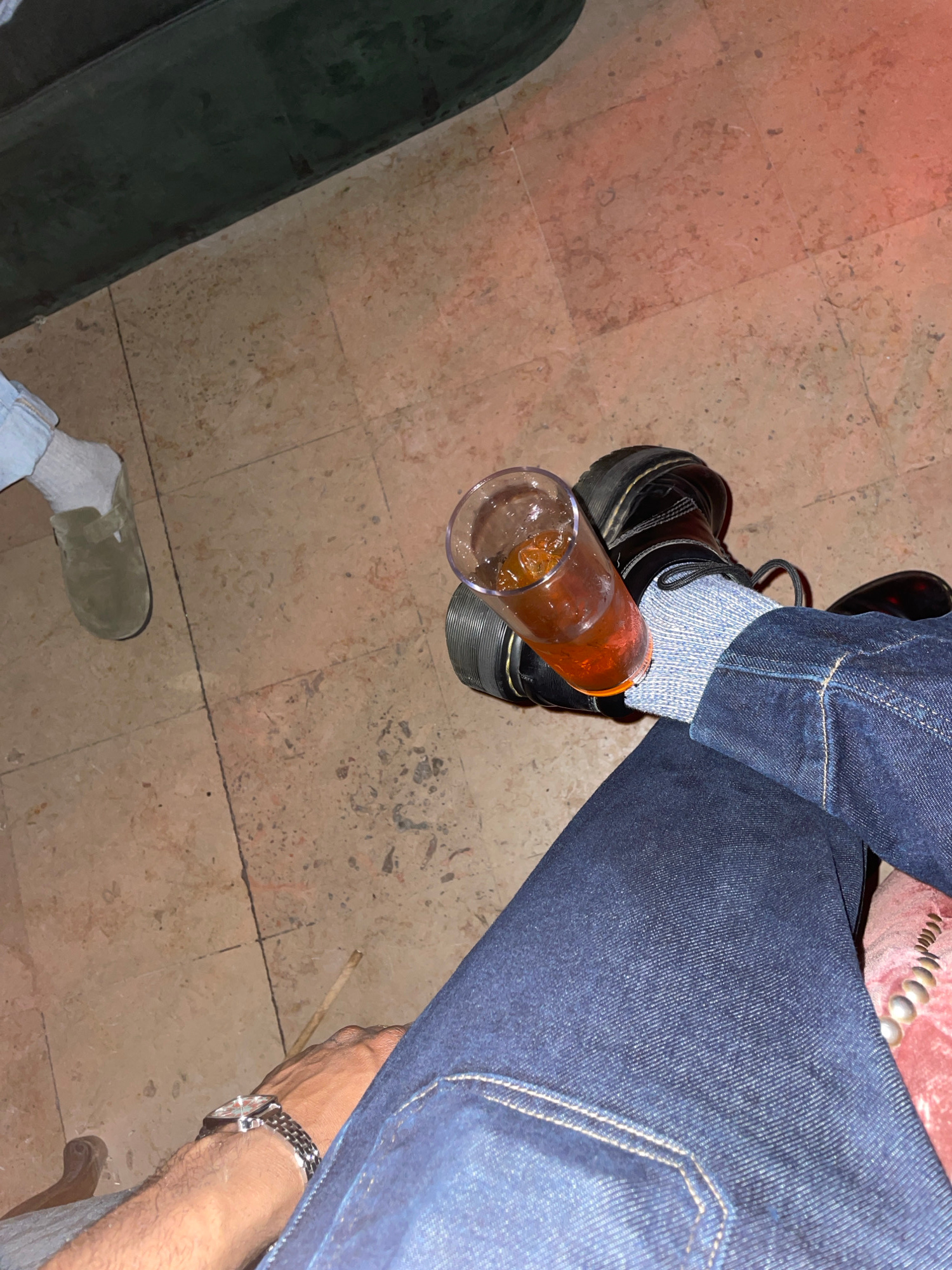 A high-angle indoor shot shows an individual wearing dark denim jeans, a gray sock, and a black platform shoe. A glass of amber liquid with ice sits precariously on the toe of the shoe. Another foot w…read more