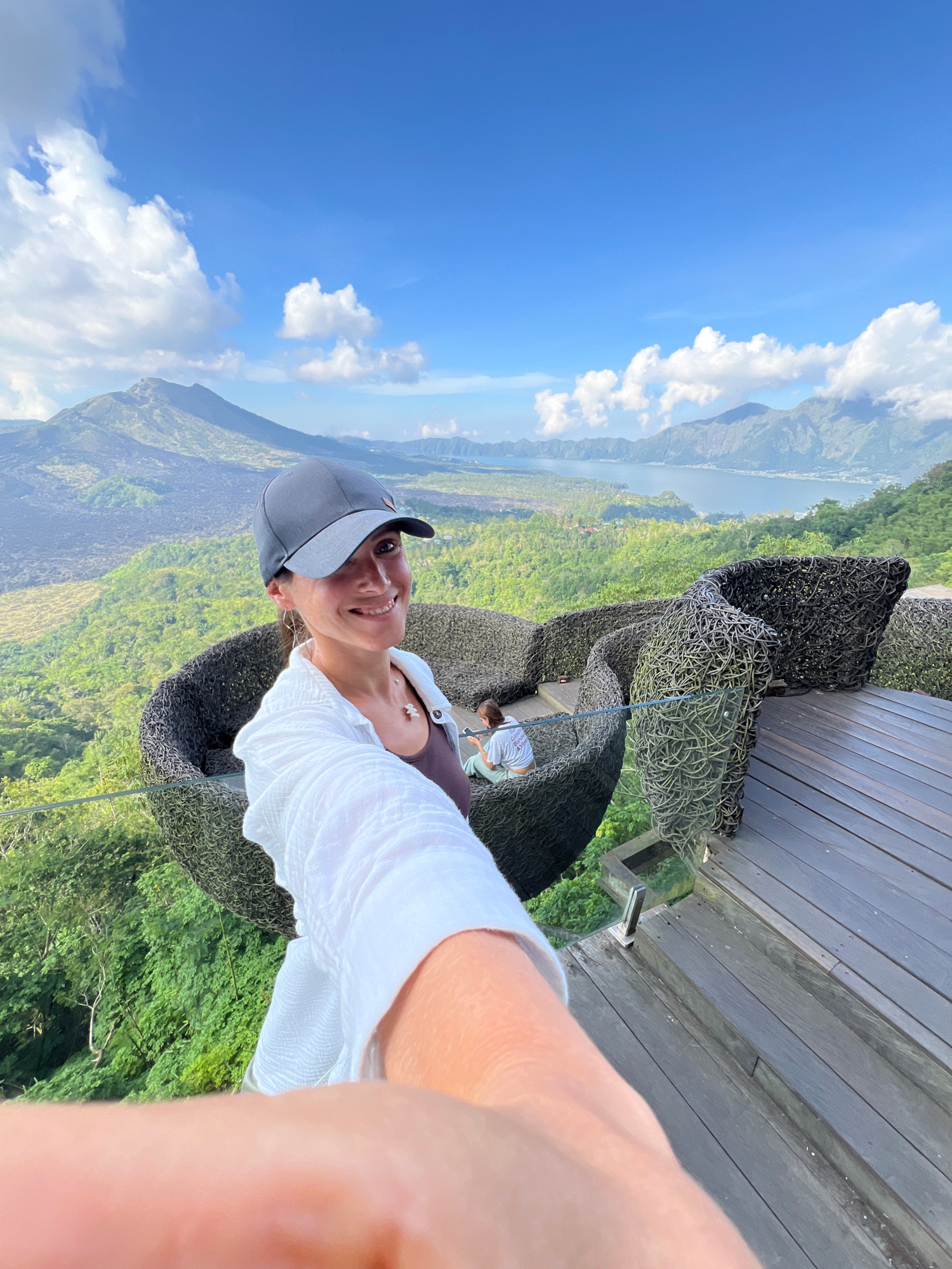 A medium-range eye-level shot depicts a woman, possibly a tourist, posing for a selfie, with a scenic view in the background. The location is in the city of Kintamani, Indonesia. The woman wears a whi…read more