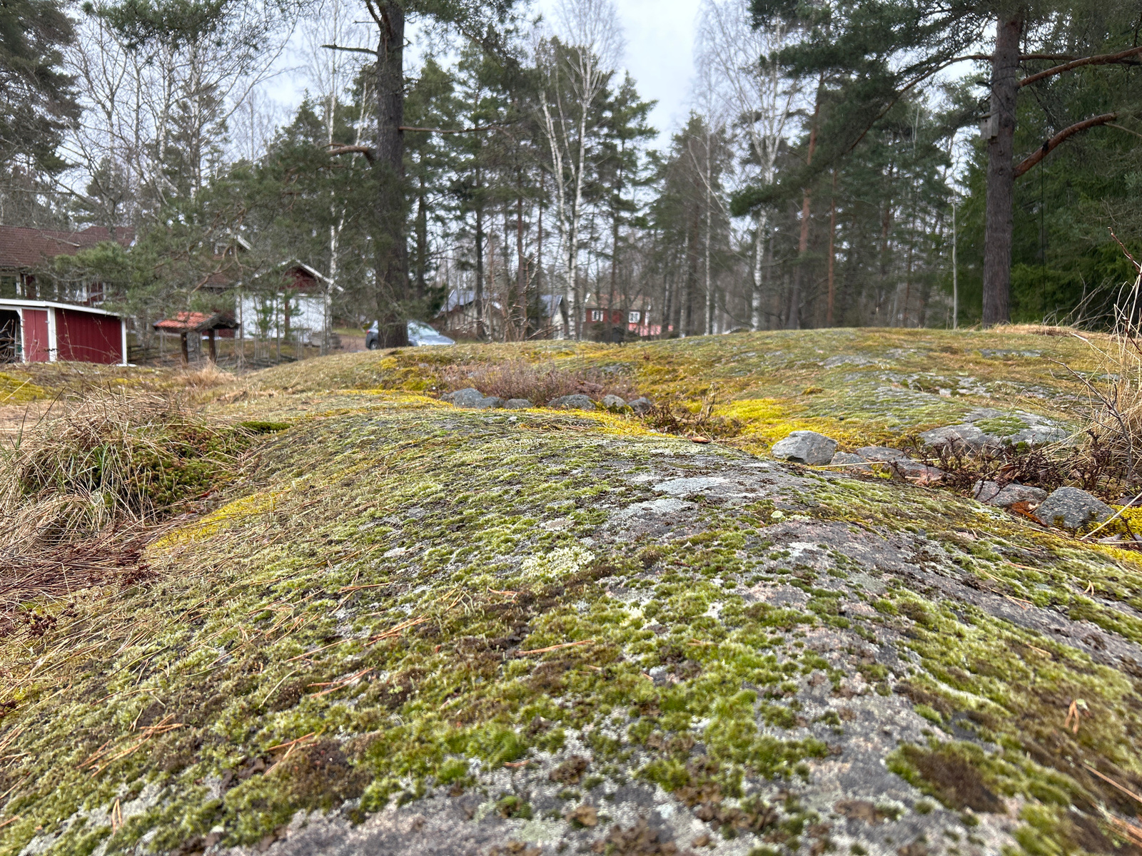 A close-up view of a moss-covered rock dominates the foreground. The rock is covered in varying shades of green and yellow moss. Several small rocks are scattered on top of the moss. In the background…read more