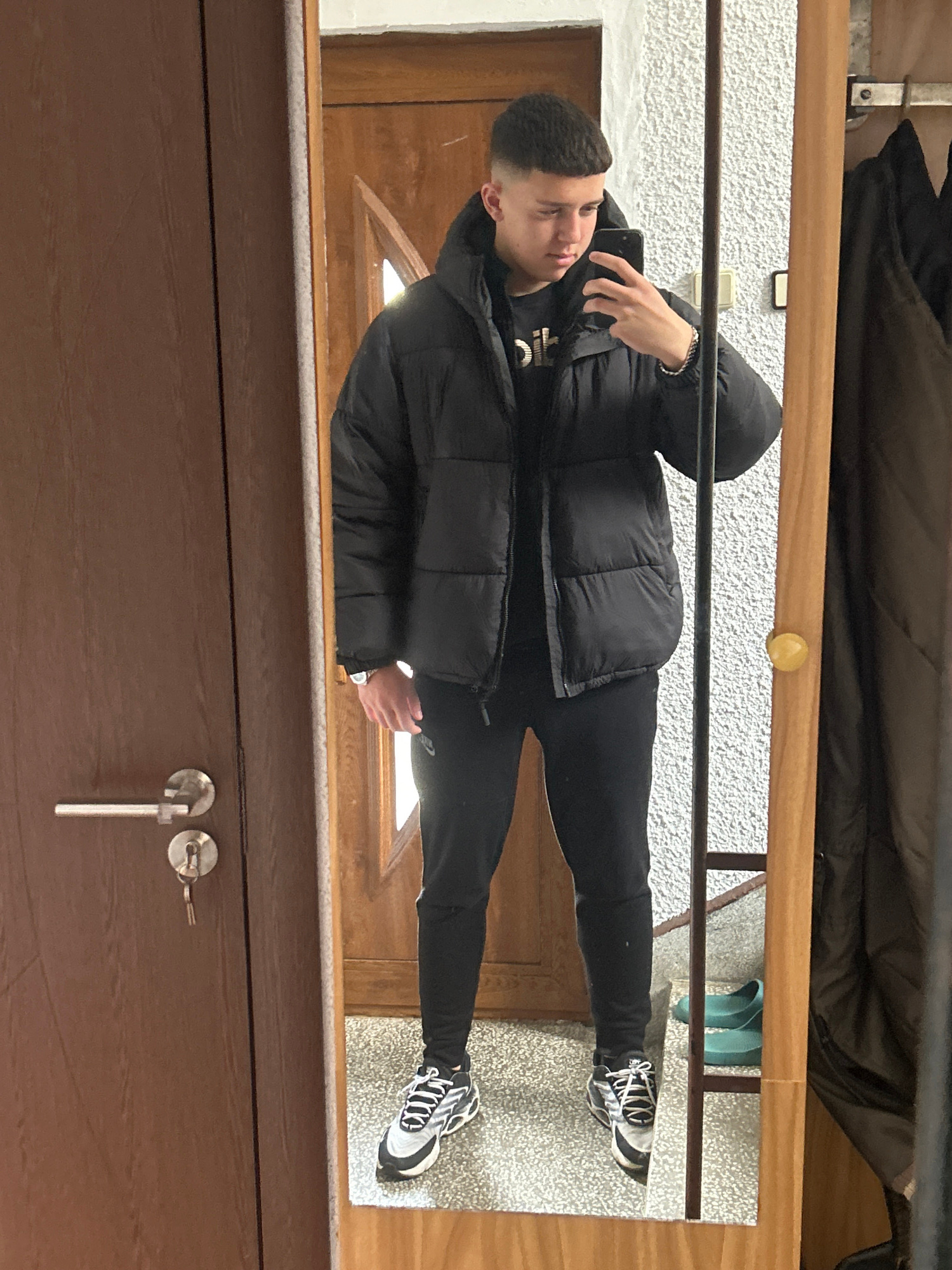A young man is taking a selfie in a mirror. He is wearing a black puffer jacket, black sweatpants, and black and white sneakers. The reflection includes the interior of a doorway, including a dark-col…read more