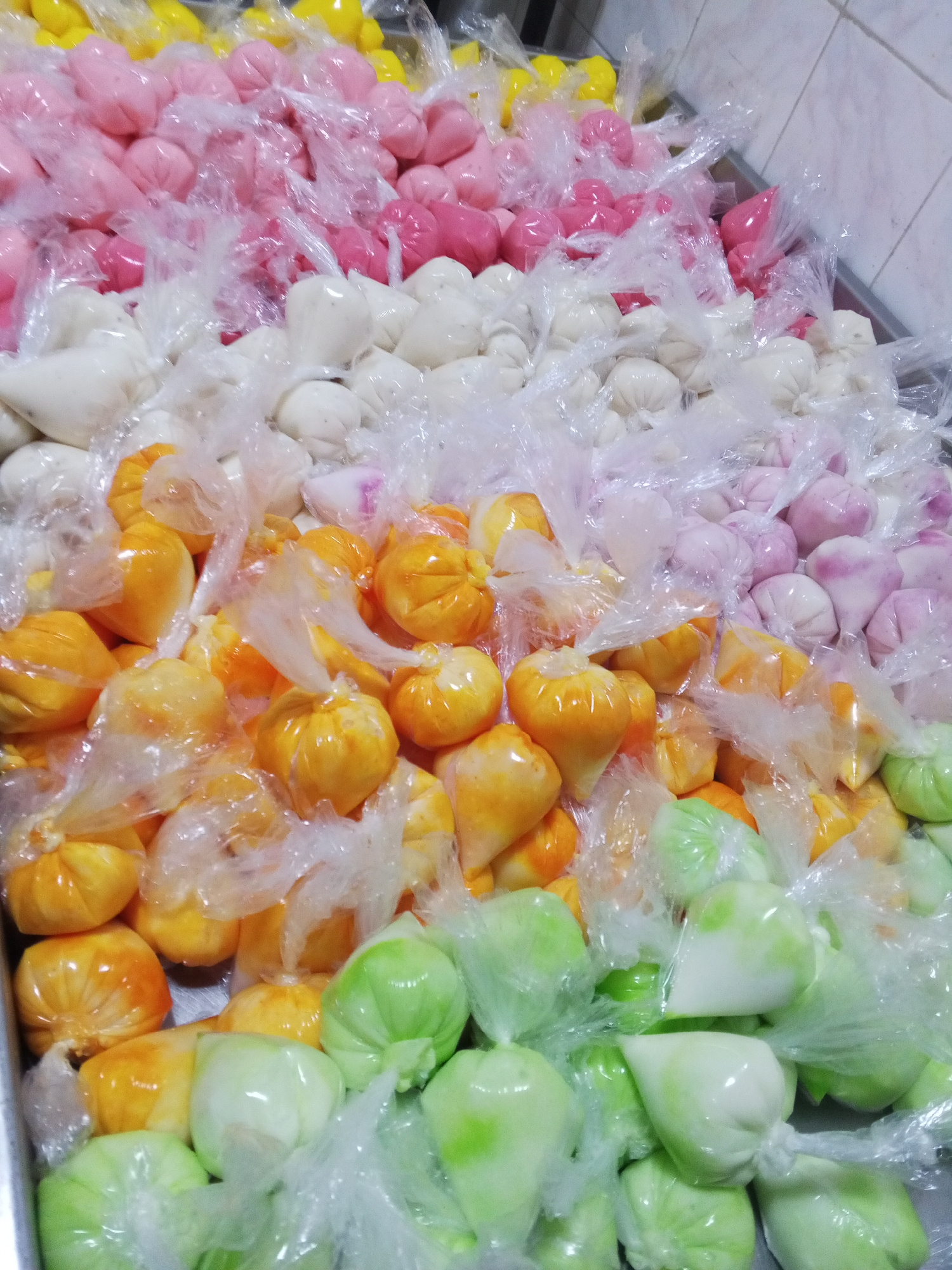 The image shows a stainless steel tray filled with small, colorful, globular-shaped items individually wrapped in clear plastic bags. The colors of the items include yellow, pink, white, orange, lightβ¦read more
