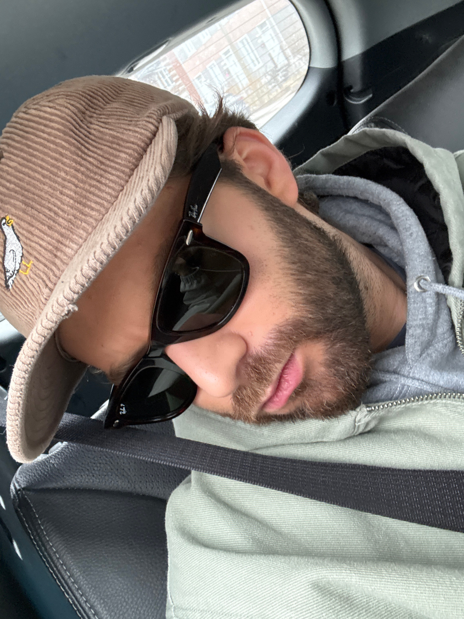 A man with a beard and sunglasses is wearing a tan corduroy baseball cap with a white duck logo, a grey hoodie, and a light green jacket while in a car with a seatbelt. The location outside the car wi…read more