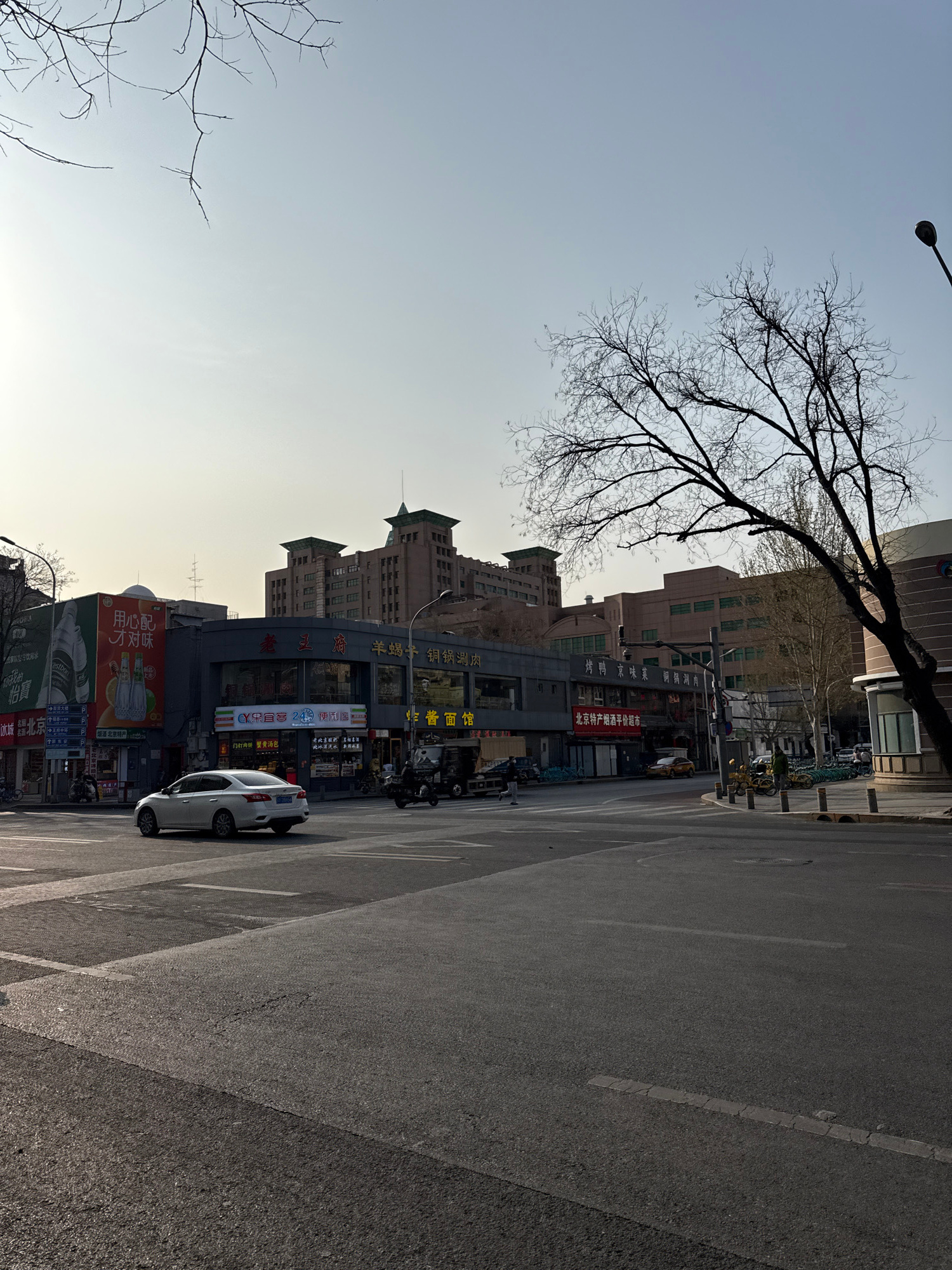 This is an outdoor urban scene in Dongcheng District, China, taken on a clear day. The camera is positioned at street level, capturing a view of a wide asphalt street. A white sedan is parked partially on a crosswalk. The street is lined with commercial buildings displaying various signs and advertisements in Chinese characters. The architecture includes traditional green roof designs on some of the buildings. A bare tree stretches across the upper portion of the frame, with its branches reaching towards the sky. A street lamp is visible above the tree. The environment appears to be a commercial area with retail businesses. The light is soft, suggesting early morning or late afternoon. | Open Wire