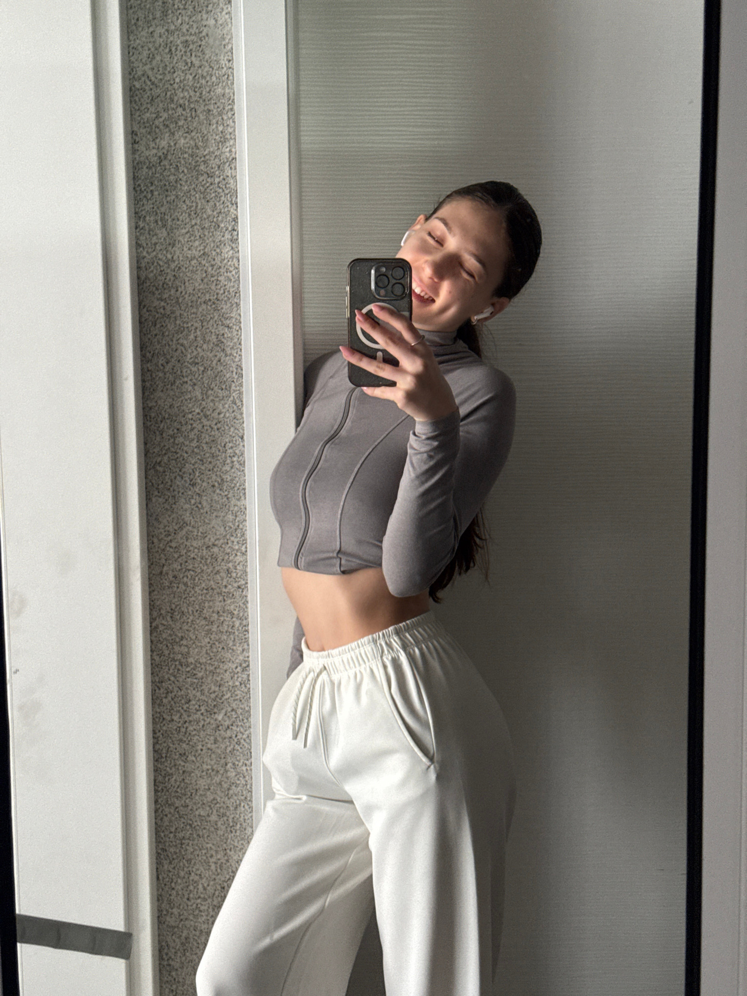 An image displays a young woman taking a mirror selfie. She is captured sideways in the reflection, with her head towards the left and her body extending towards the right. She has dark hair and is we…read more