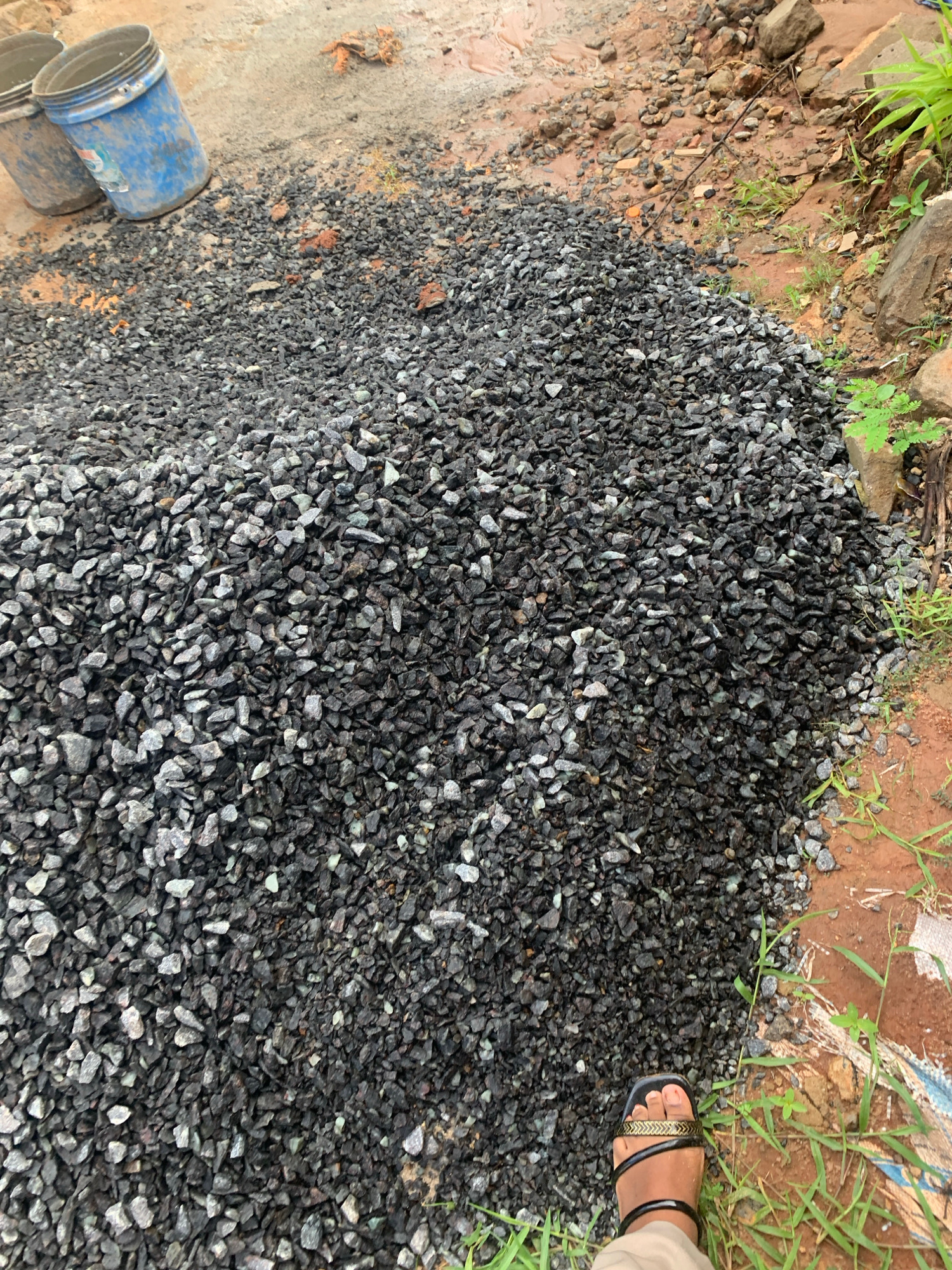The image displays an outdoor ground-level scene in Dar es-Salaam, Tanzania, centered on a substantial pile of dark grey crushed aggregate. This aggregate occupies the majority of the frame's central…read more