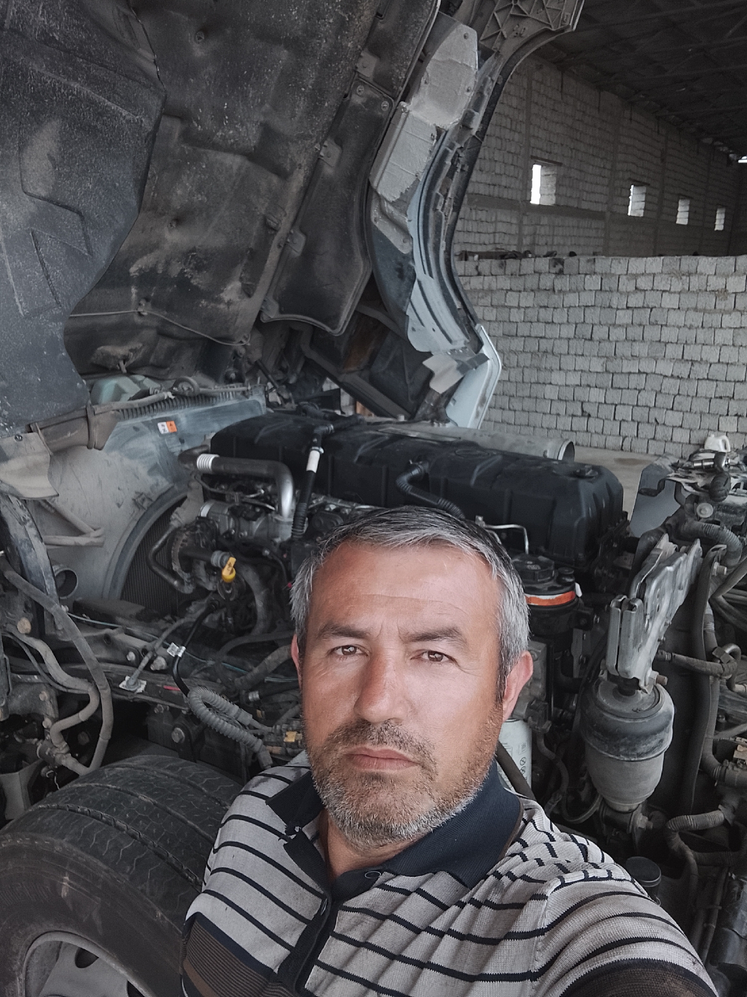 A middle-aged man stands in front of a large, open-hooded truck, presumably in a garage or maintenance facility. The man has short, grey hair and a salt-and-pepper beard, wearing a striped shirt. The…read more
