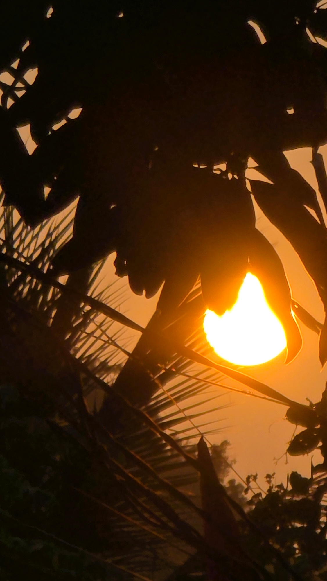 The image shows a view of the sun setting through trees, possibly taken in the Bac Natural Heritage Area Trang, Vietnam. The leaves are silhouetted in the foreground. The sun is a bright, central poin…read more