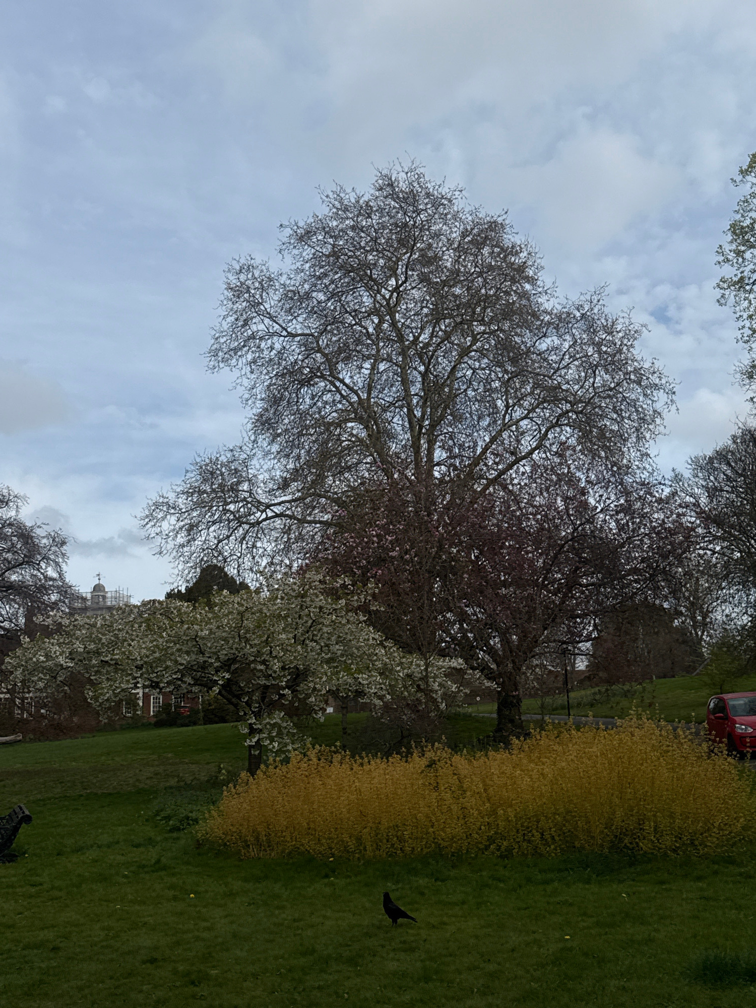 The image depicts a park scene in London, United Kingdom, under a cloudy sky. Dominating the view are several trees, one large bare tree taking prominence. Another tree is blossoming with white flowerβ¦read more