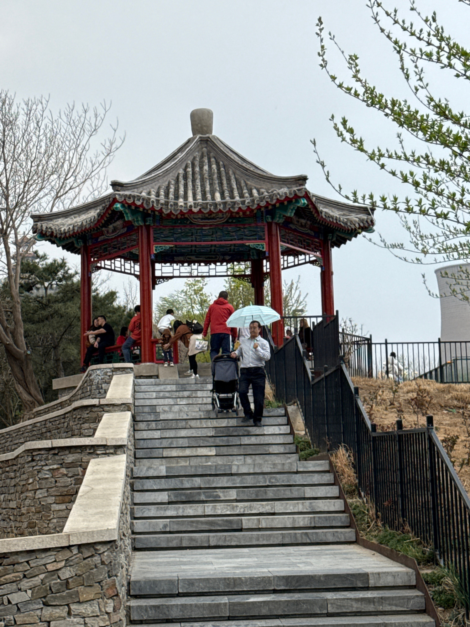 The photograph captures a scene in Shijingshan District, China, prominently featuring a traditional Chinese pavilion. The pavilion's architecture includes a multi-tiered, gray tiled roof with ornate d…read more
