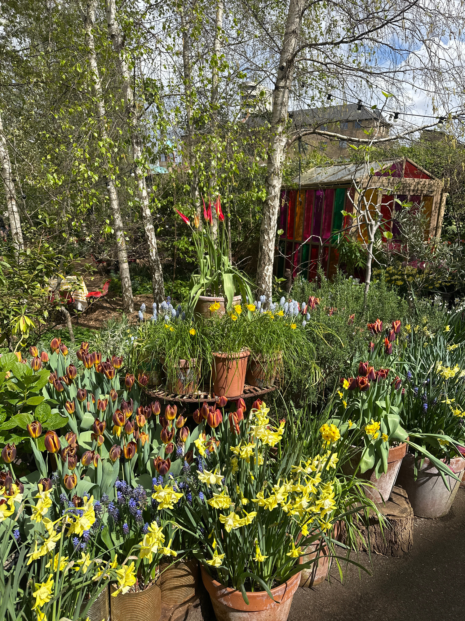 The scene captures a vibrant garden setting in London, United Kingdom. The focus is on a layered display of flowers in terracotta pots. Daffodils, tulips of various shades, and bluebells are prominent…read more