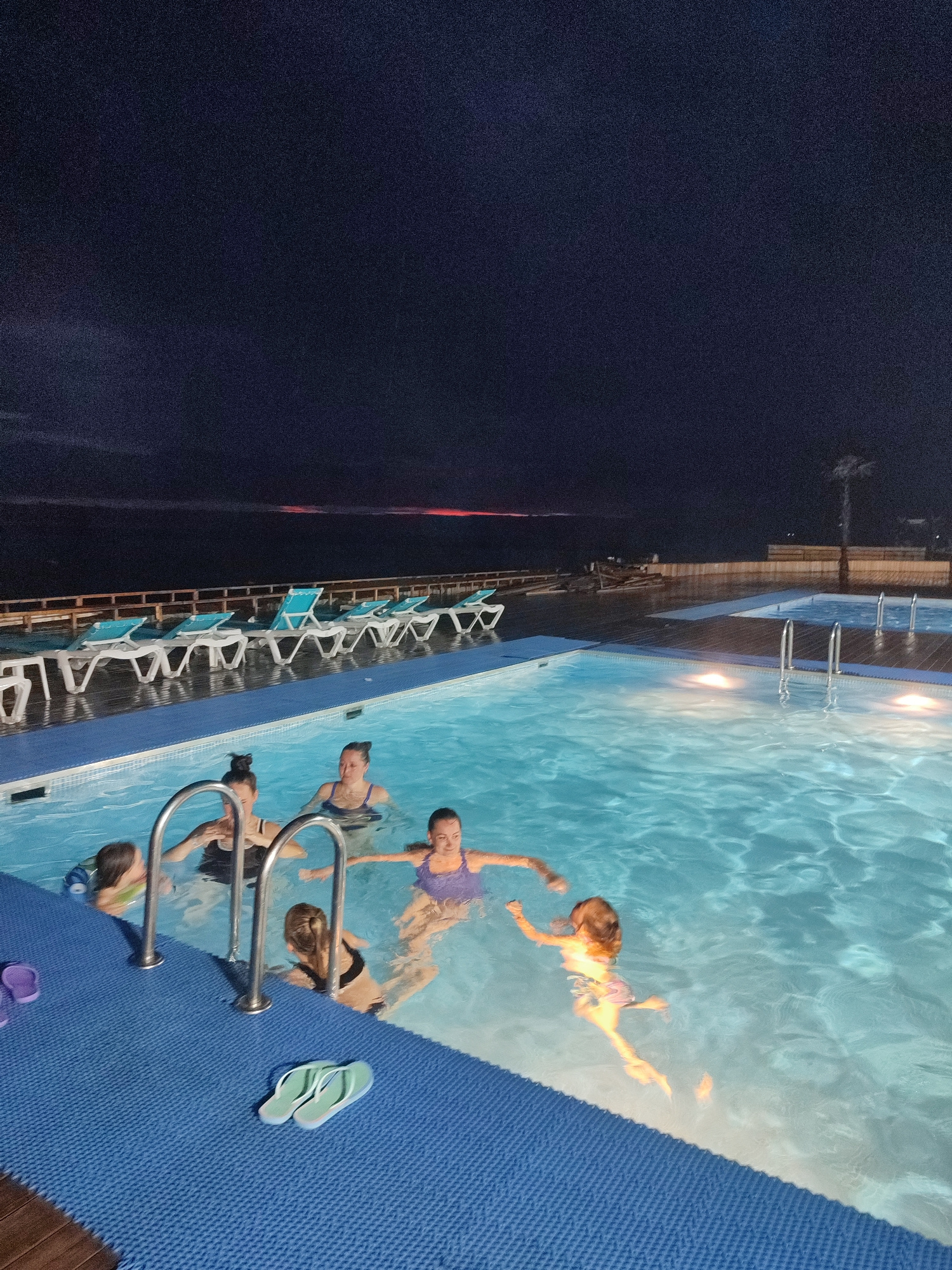 The image depicts a group of people swimming in an outdoor pool at night. The pool is illuminated by underwater lights, creating a bright, inviting atmosphere. Several adults and at least one child ar…read more