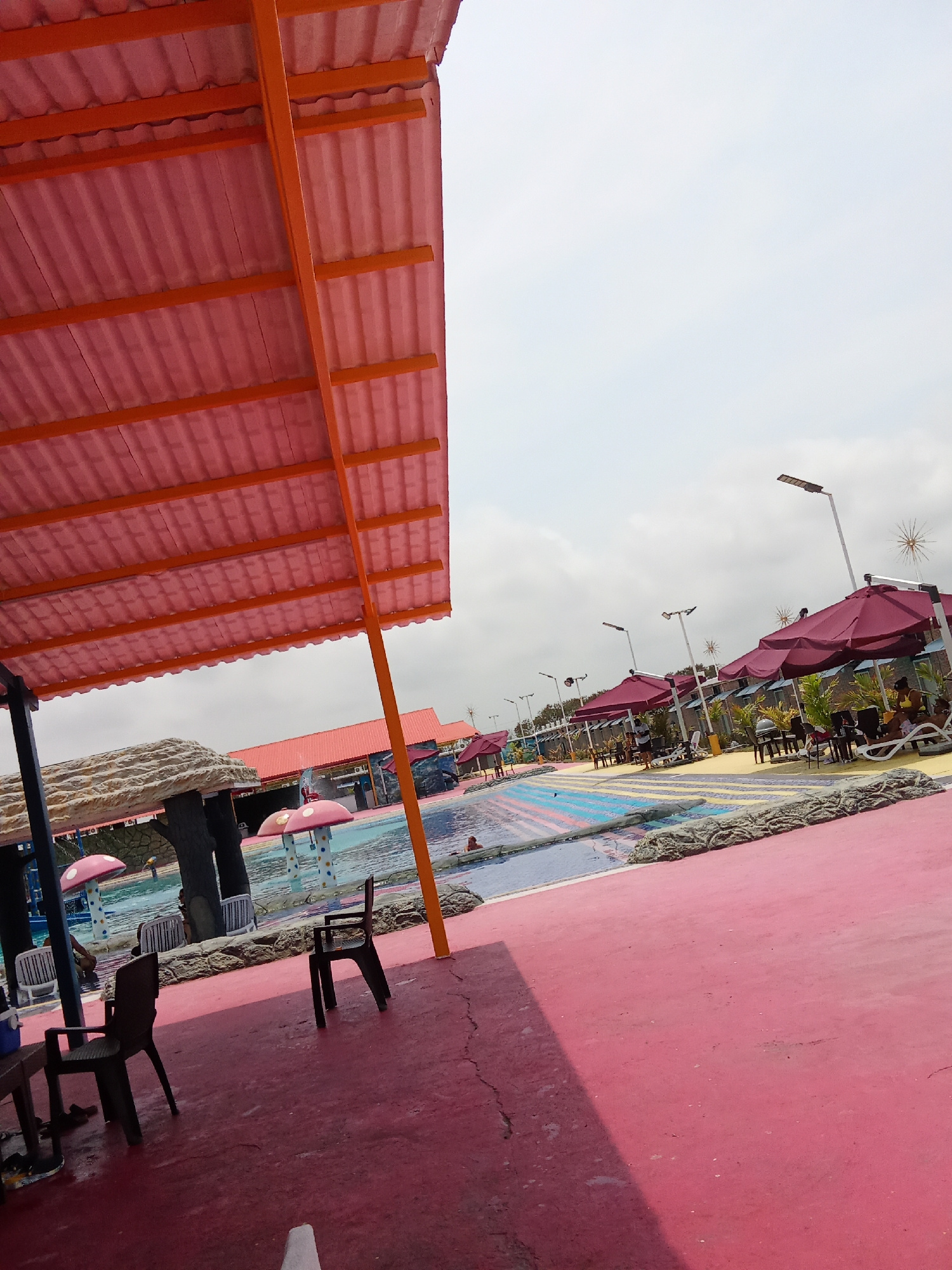 The image depicts an outdoor swimming pool area, potentially a water park, in the city of Las Delicias, Venezuela. A pink, corrugated roof covers a portion of the foreground. Underneath are dark-color…read more