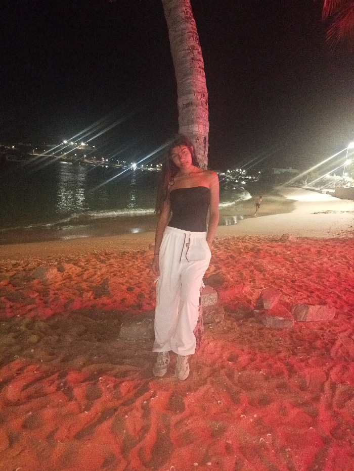 A young woman stands next to a palm tree on a beach at night. She wears a black strapless top and white pants. In the background, the sea meets the shore, illuminated by distant lights. The sand aroun…read more