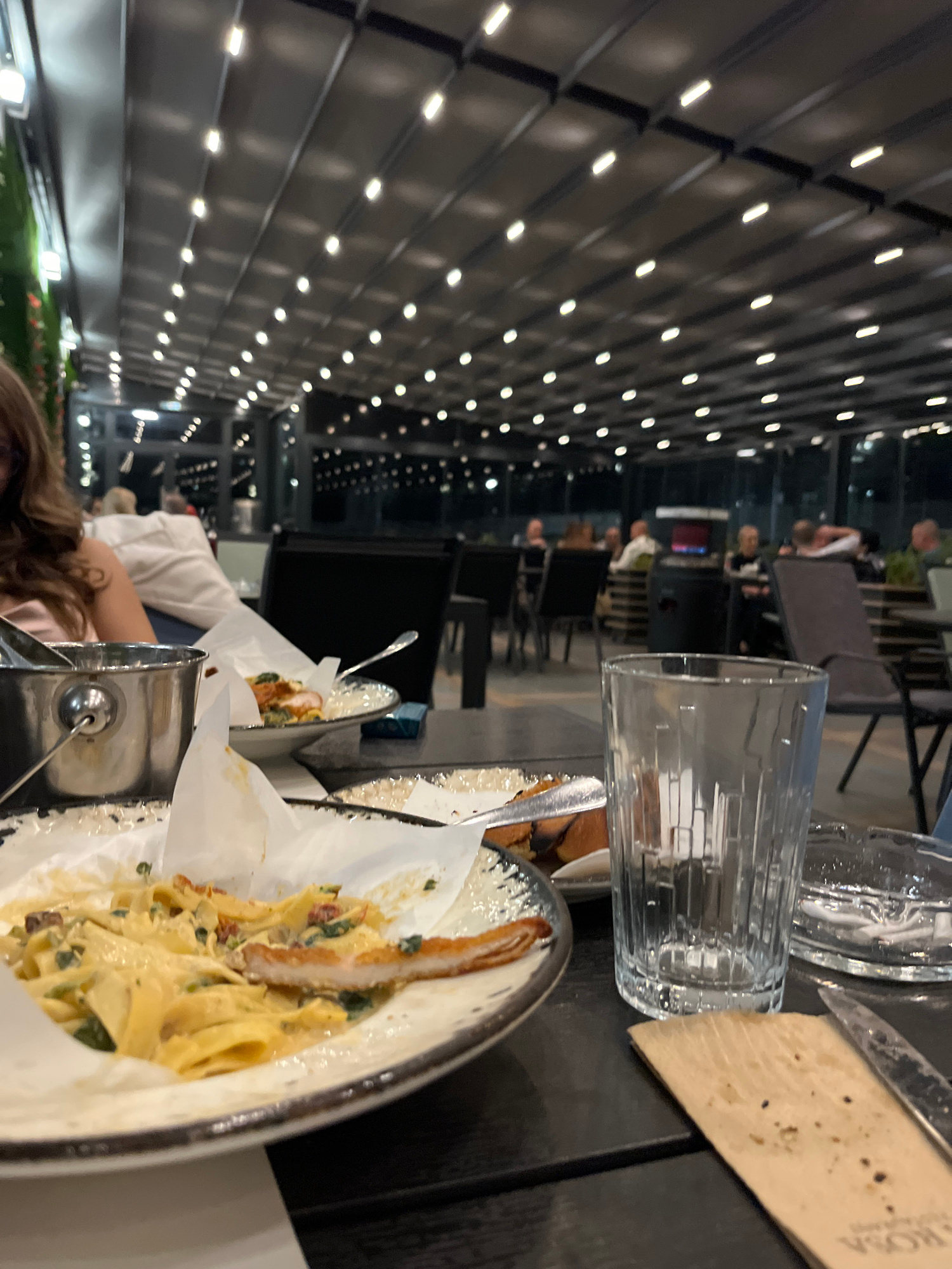 The image shows a table setting at a restaurant, likely outdoors given the view of a building facade with numerous lights visible in the background. A glass of water and silverware are placed on the t…read more