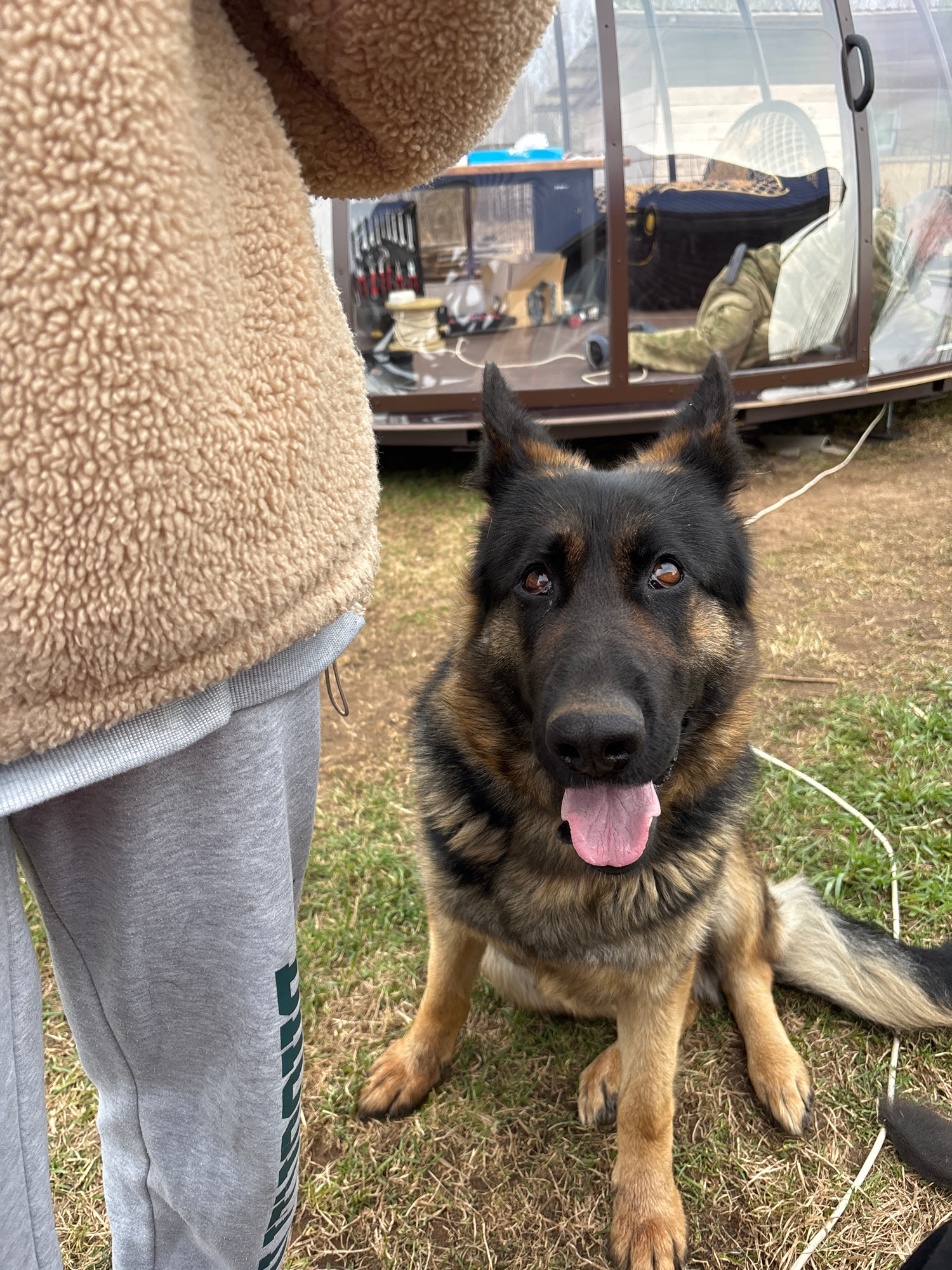 A German Shepherd dog, predominantly black and tan with some brown fur, lies on a patch of grassy and dirt ground, looking directly upwards towards the viewer. Its ears are perked, and its tongue is eā¦read more