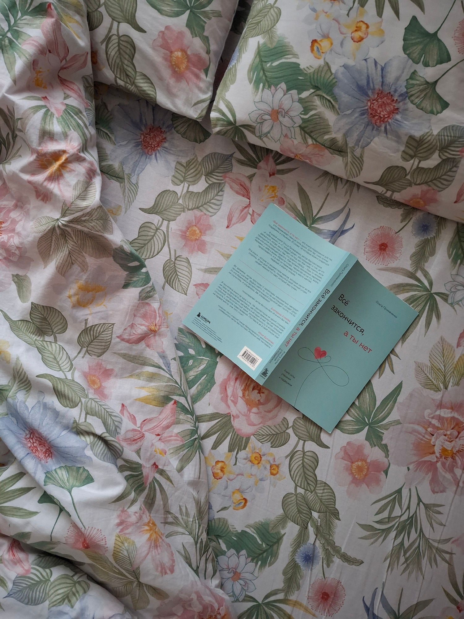 A top-down shot shows an open book resting on a floral-patterned bed with matching pillows. The book, titled "Всё закончится, а ты нет" (Everything will end, but you won't), is by Ольга Примаченко. Th…read more