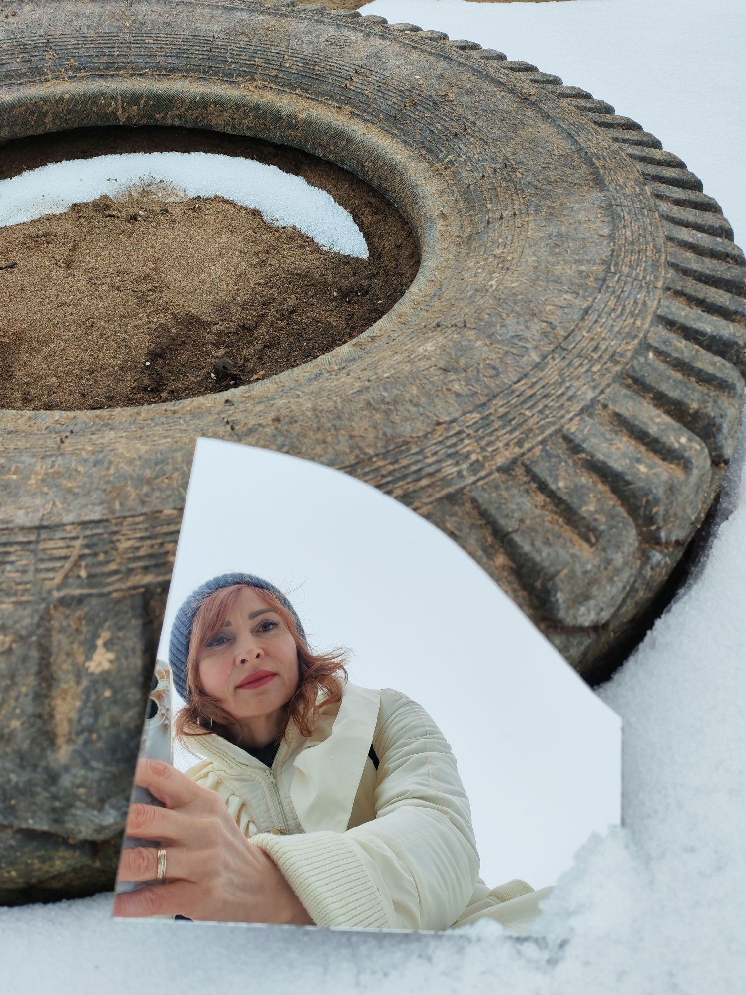 A woman is reflected in a shard of mirror held up in front of a large, old tire in a snowy landscape. The tire is filled with dirt and some snow. The woman has red hair and is wearing a blue beanie an…read more