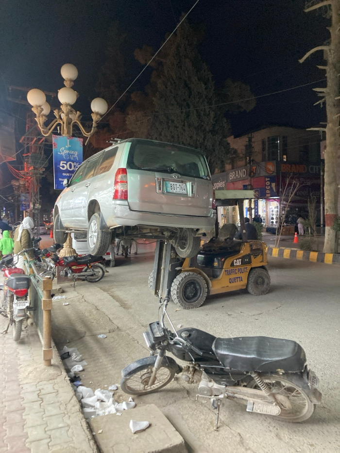 At night, a silver van bearing license plate BGT-764 is lifted by a yellow CAT Traffic Police Quetta forklift. A black motorcycle sits nearby. "Spring 50%" signage is visible next to the van. Backgrou…read more