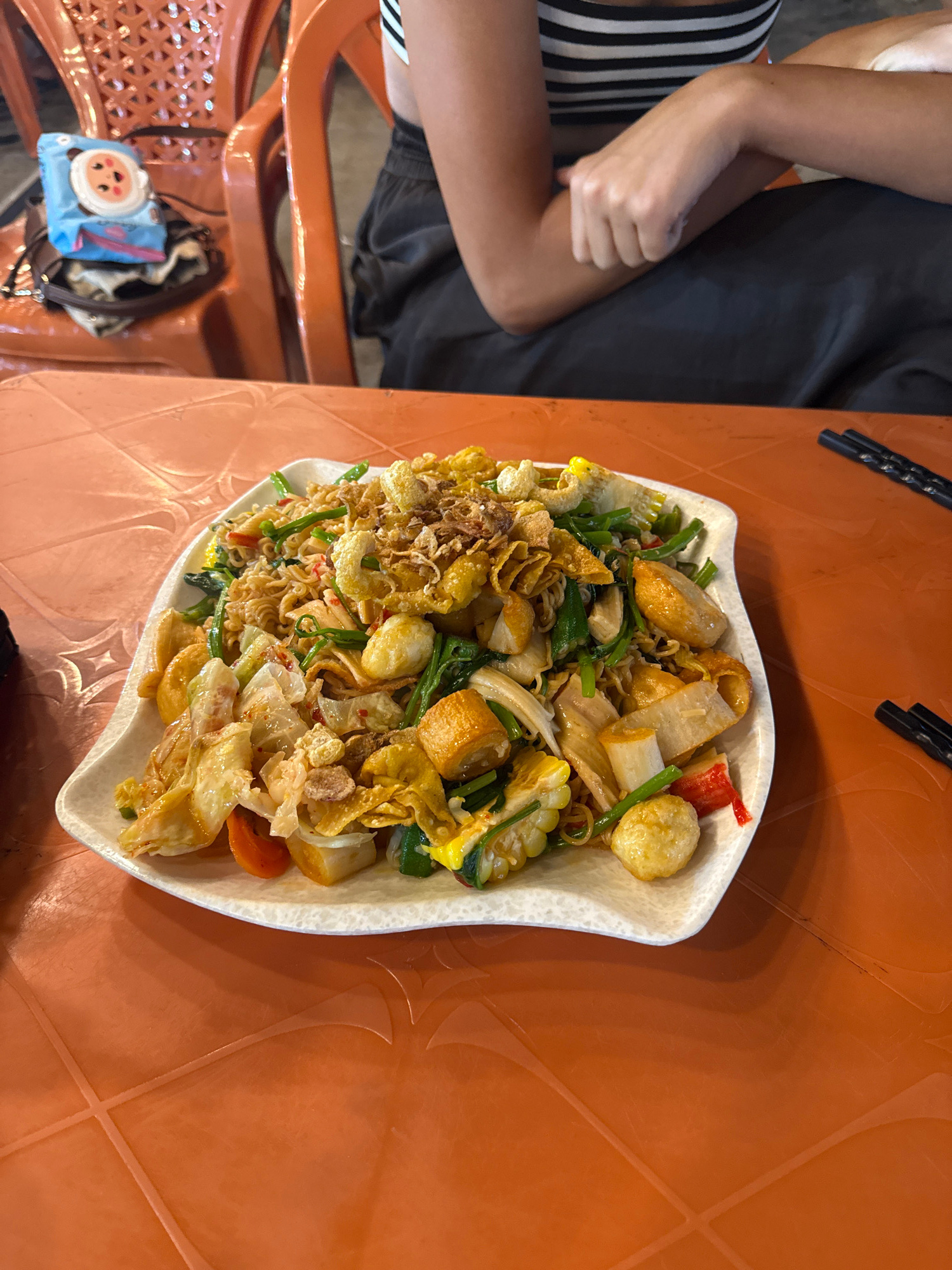 The image shows a plate of mixed food placed on an orange table with a geometric pattern. The food appears to be a Vietnamese-style mixed dish (possibly "mì trộn") containing noodles, vegetables (like…read more