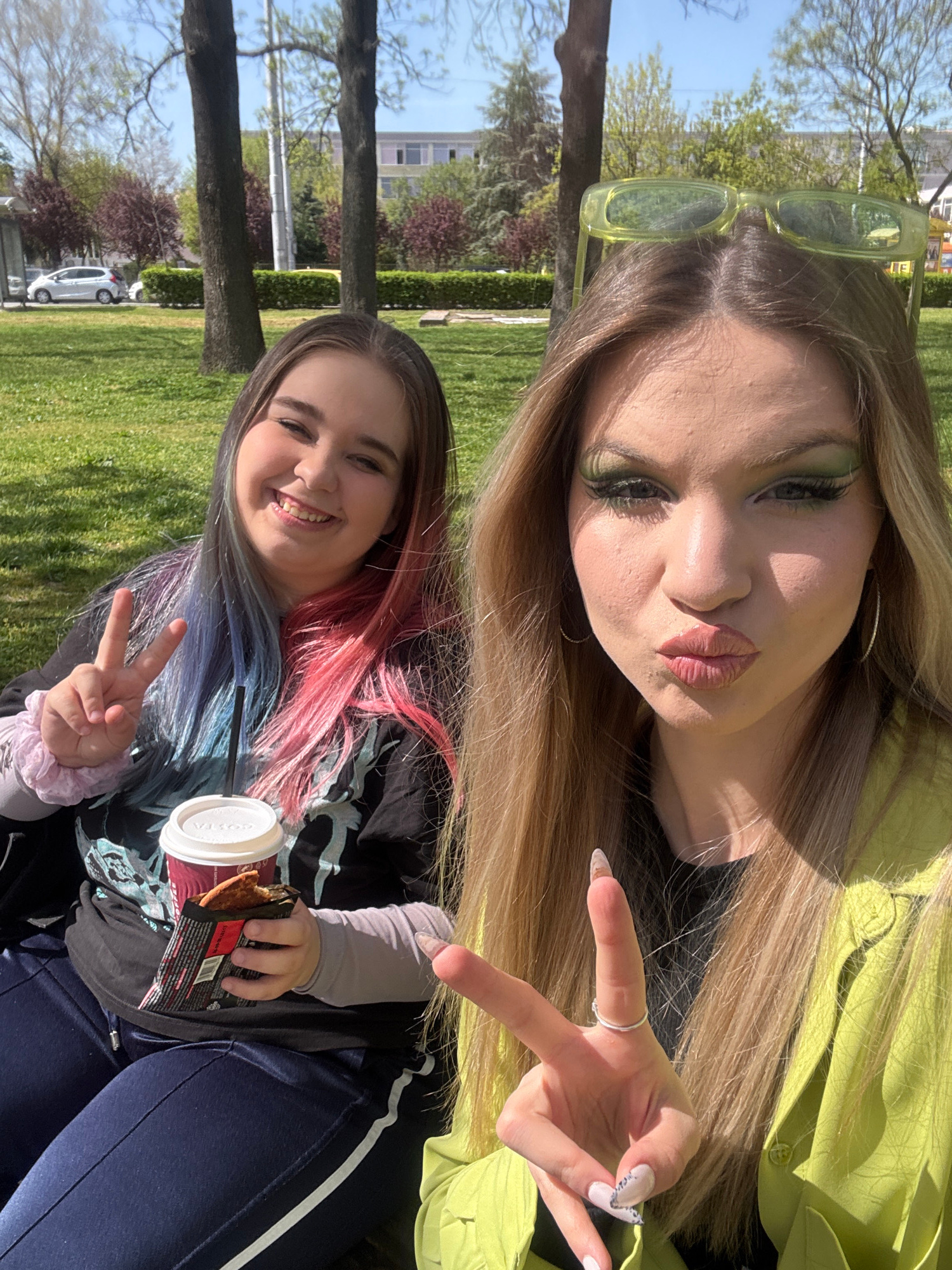 This rotated image, likely a selfie, features two young women enjoying a bright, sunny day outdoors in what appears to be a park or green space in Plovdiv, Bulgaria. The woman positioned at the top o…read more