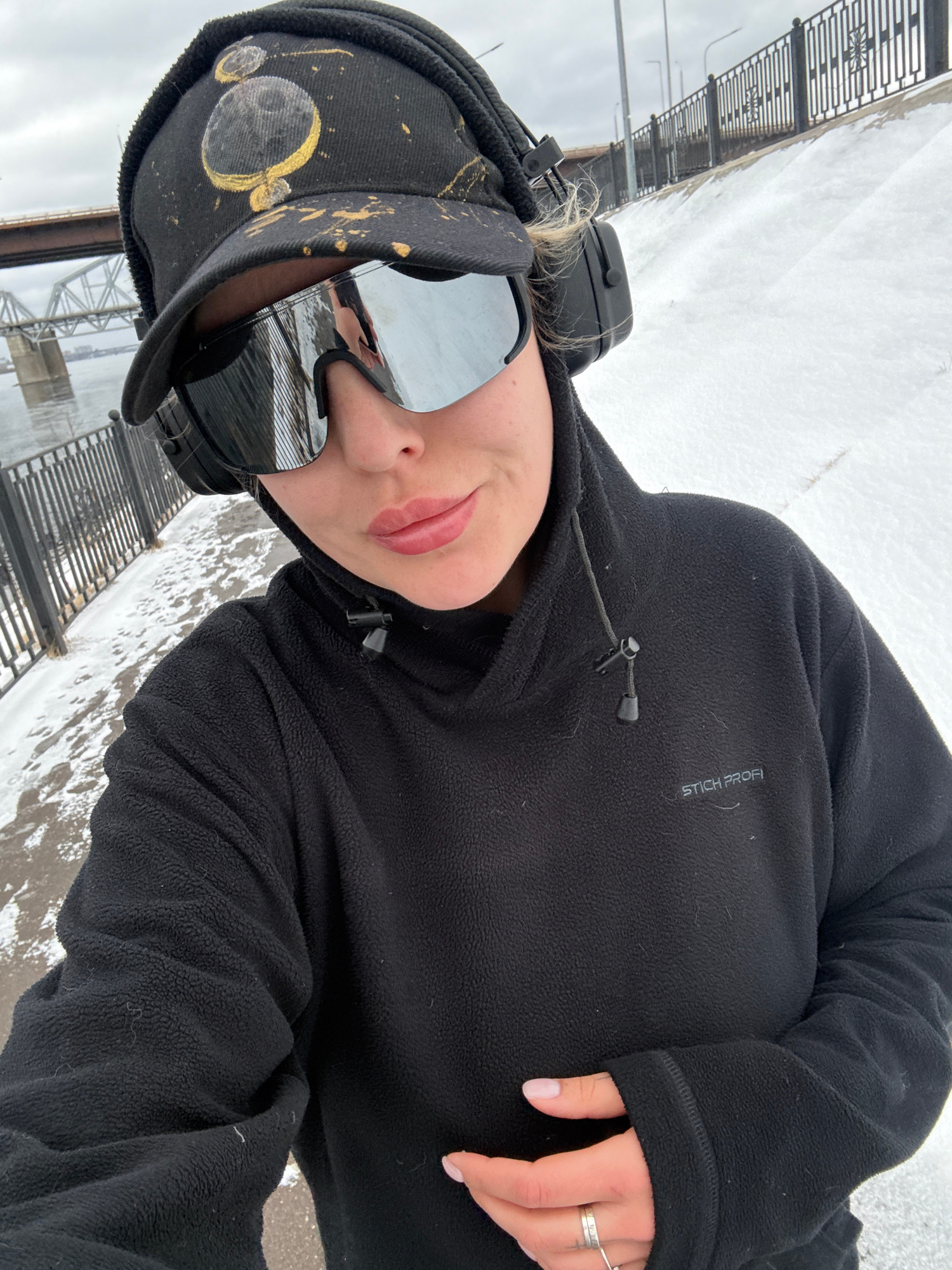 A woman in a black fleece jacket and decorated black hat with sunglasses stands on a bridge, likely the Vinogradovsky Bridge in Krasnoyarsk, Russia, given the bridge's design and the snowy surrounding…read more