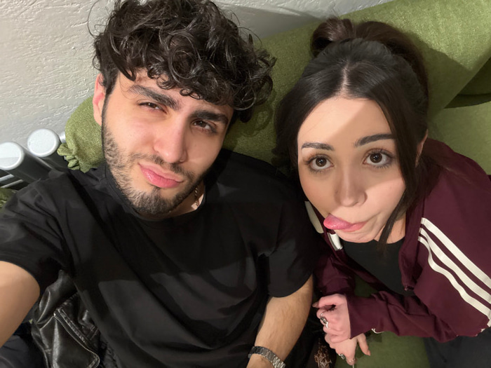 Two individuals, a woman and a man, are captured in a close-up, top-down shot, appearing to be lying down side-by-side. The image is oriented such that their heads are towards the bottom of the frame,…read more