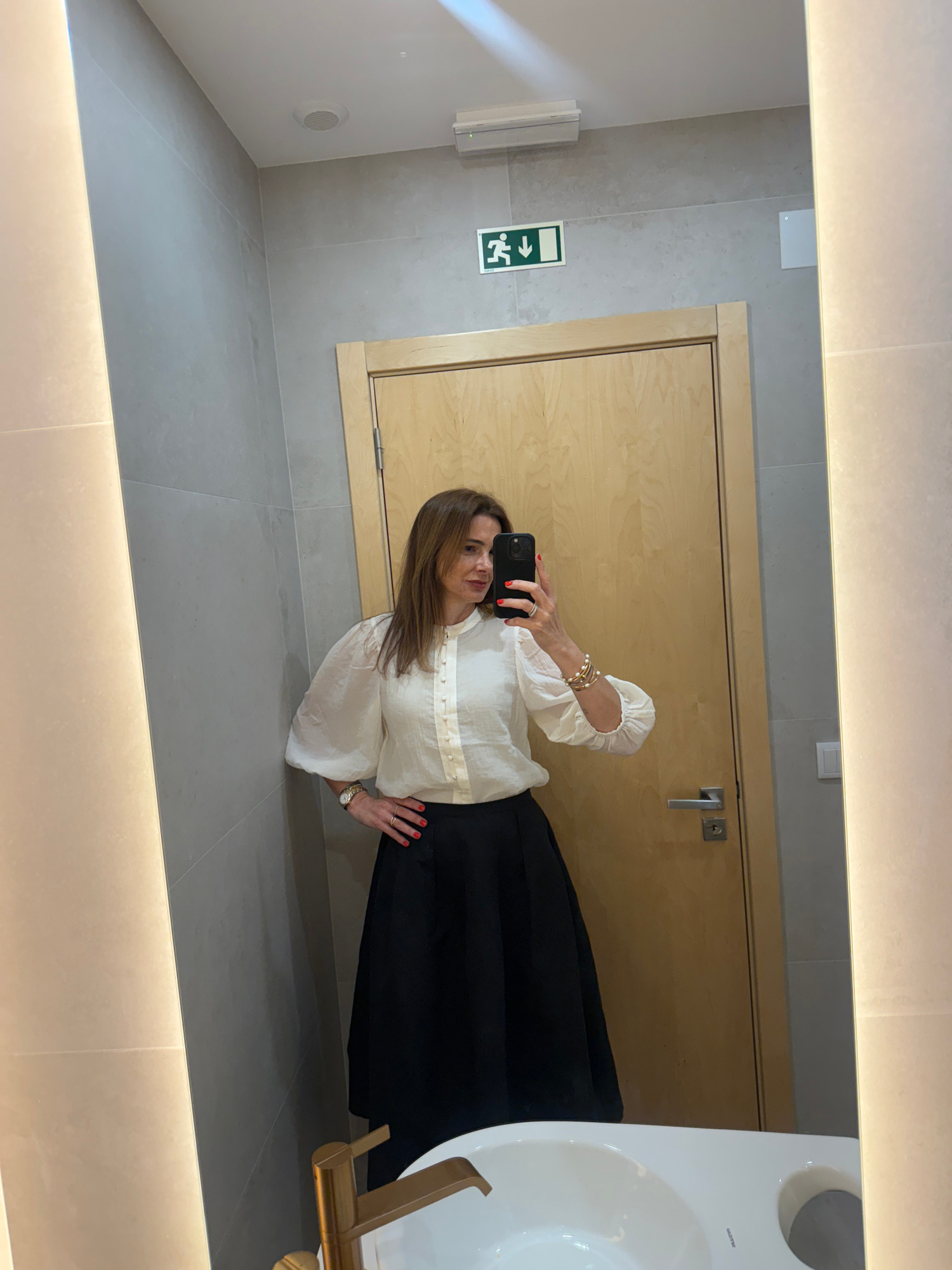 A woman is taking a selfie in a bathroom. The bathroom features gray tiles, a wooden door, and a white sink. An emergency exit sign is visible on the wall. The woman is wearing a white blouse and a bl…read more