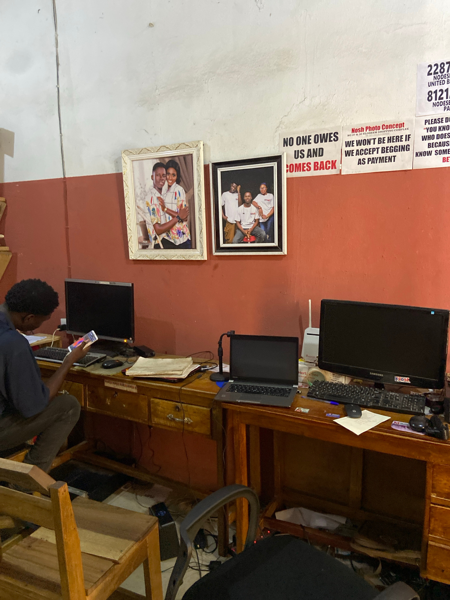 The media file displays an interior view of a small business, likely a photo studio named 'Nosh Photo Concept,' located in Mararaba, Nigeria. The image is taken from a slightly elevated angle and is r…read more