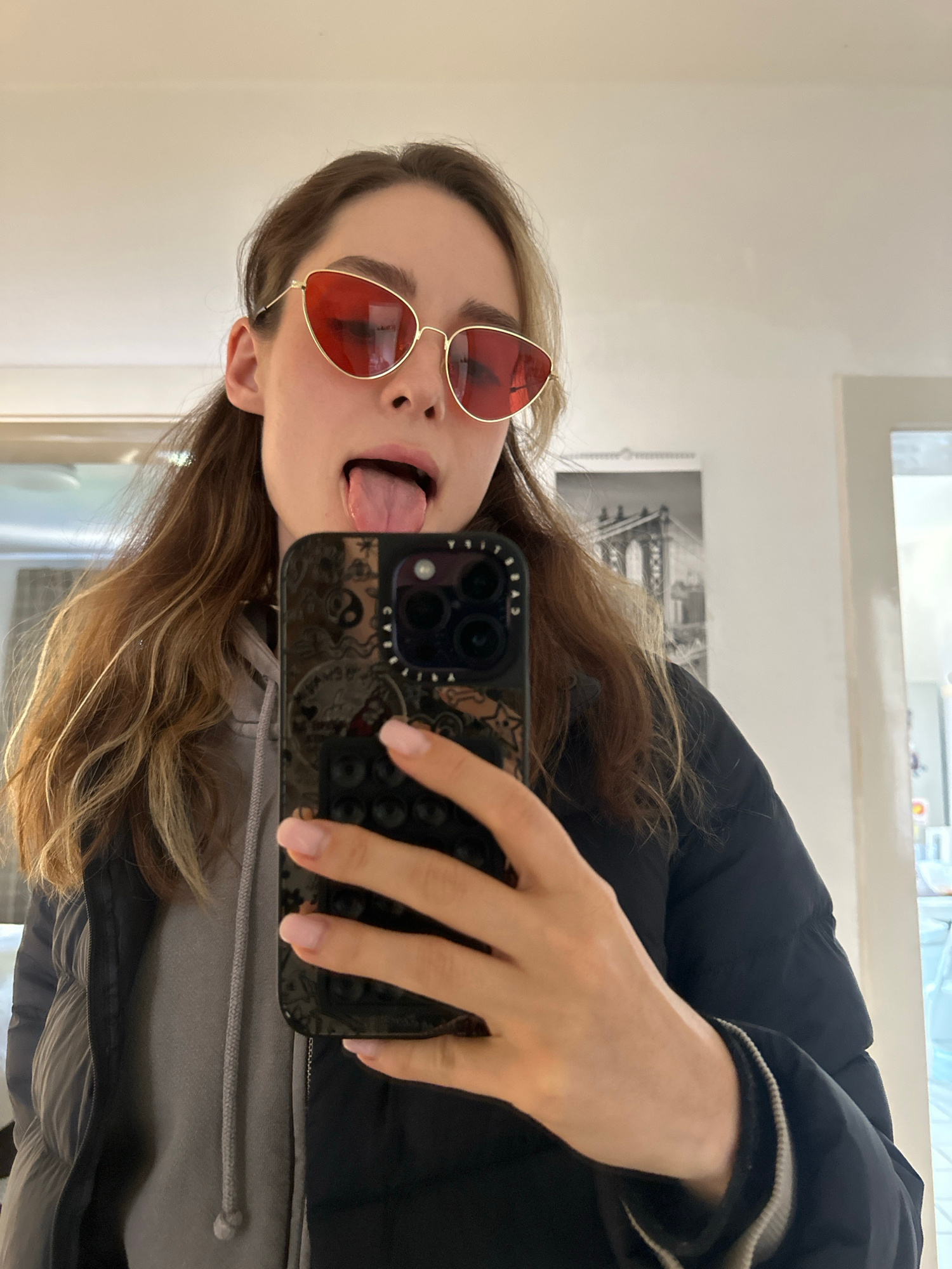 A person with long, light brown hair and fair skin is holding a smartphone up to take a selfie. She is wearing teardrop-shaped red sunglasses. Her tongue is sticking out. She has on a grey hoodie and…read more