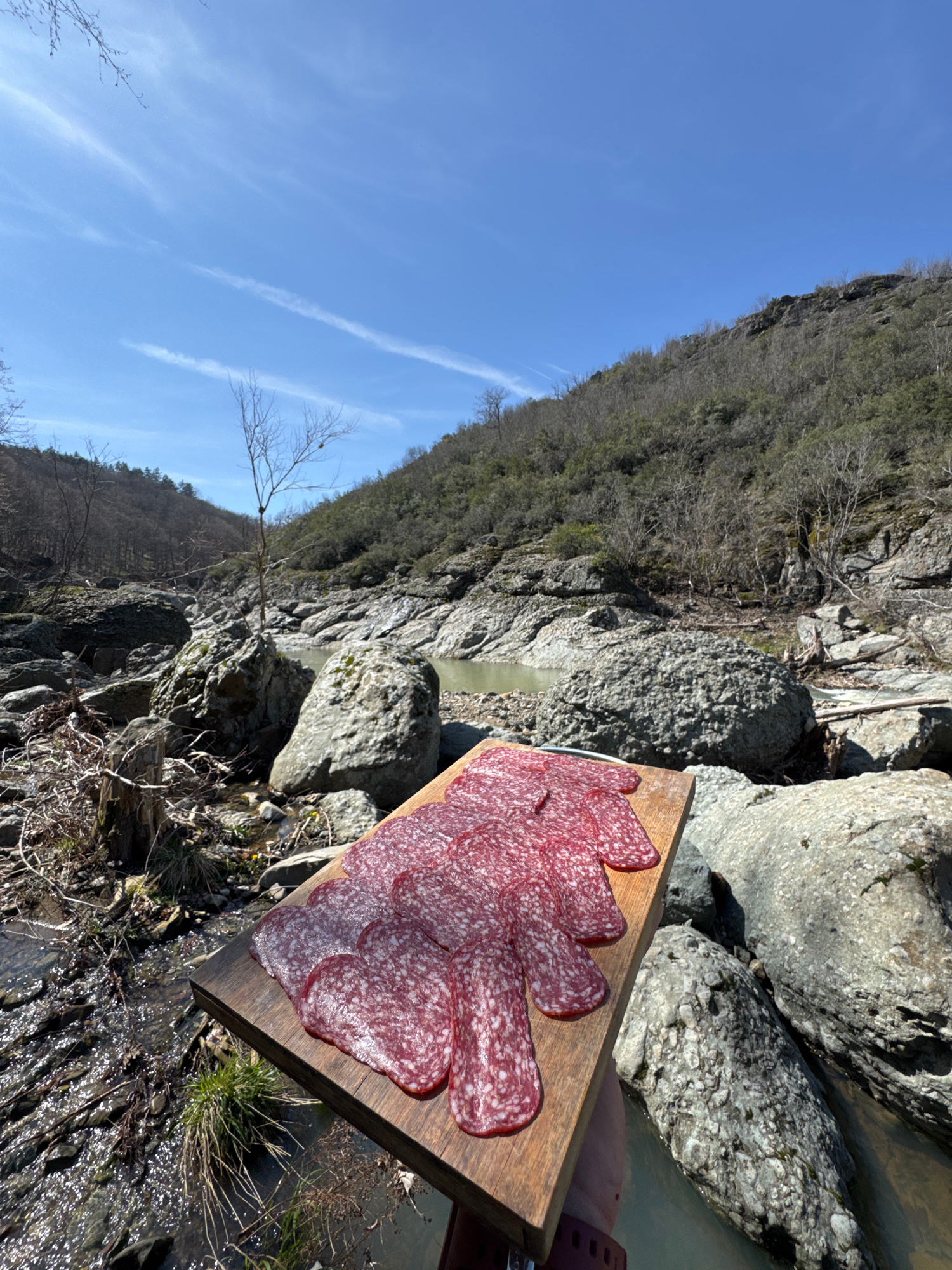 The image captures an outdoor scene within a rocky river valley in Fazanovo, Bulgaria, under a clear blue sky marked by faint contrails. In the lower right foreground, a partially visible human hand,…read more