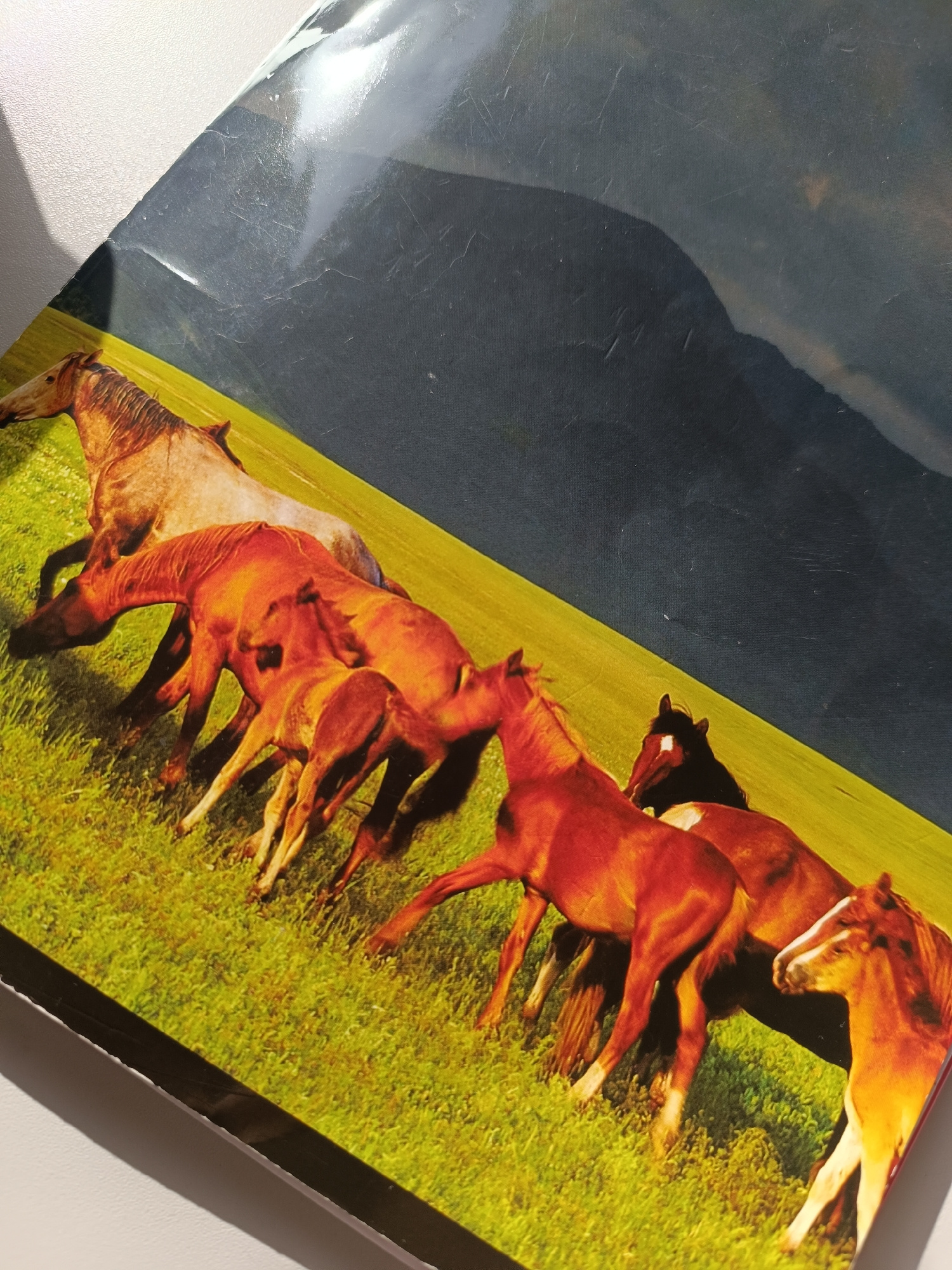 The image shows a book cover with a picture of a herd of horses running on a grassy field. The background of the image transitions to a dark, mountainous landscape. The cover appears to be glossy. The…read more