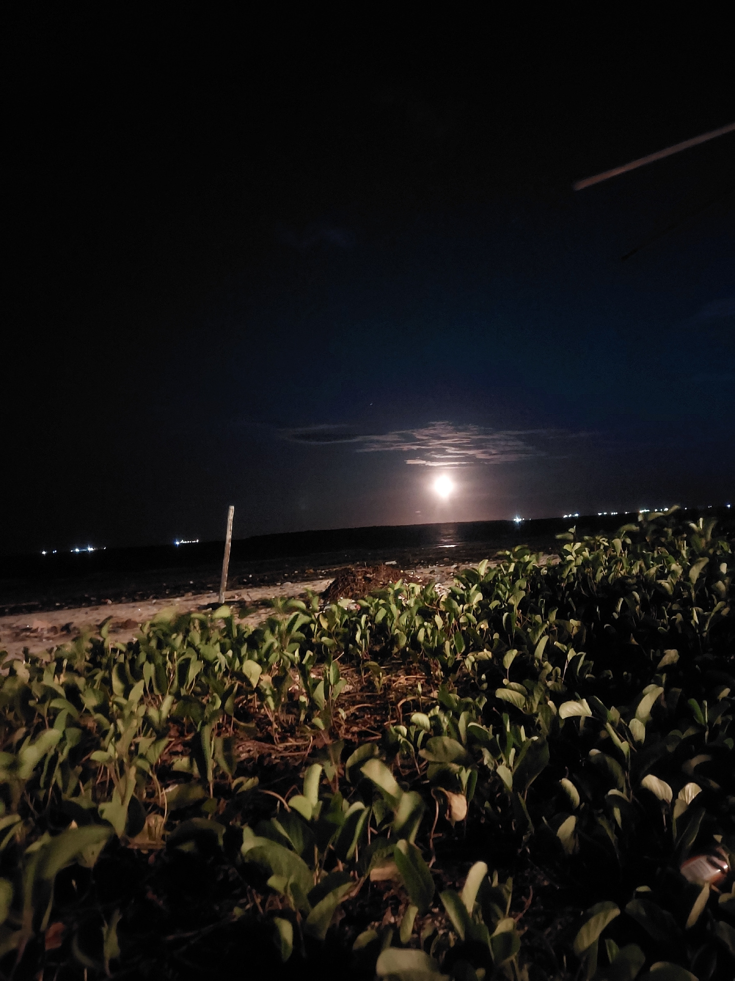 At night in Dar es Salaam, Tanzania, a view from the shoreline shows water reflecting a bright moon. A cluster of dark green vegetation lines the edge. A wooden post juts out from the shoreline into t…read more