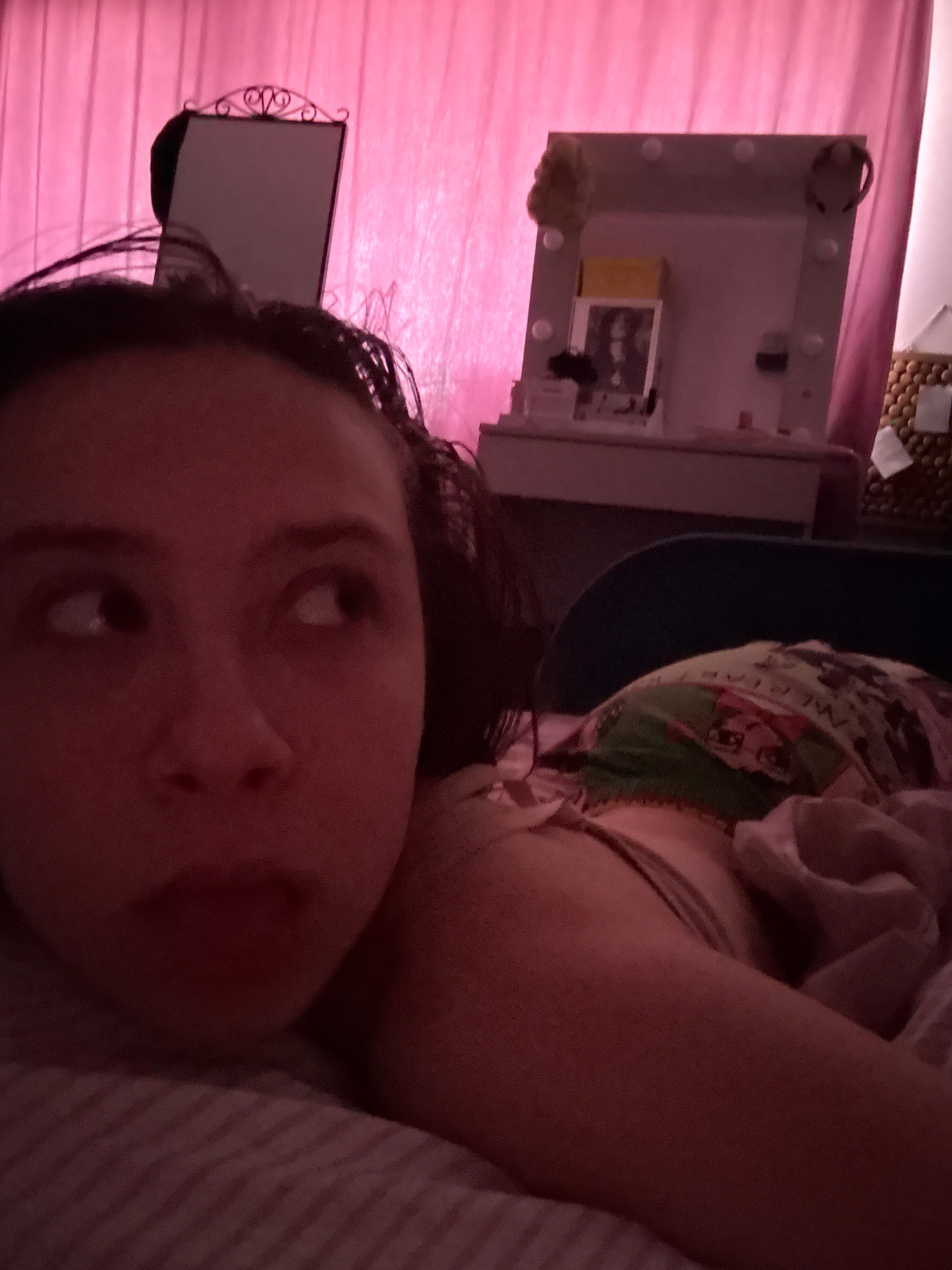 A dimly lit, close-up photograph depicts a person lying down, presumably on a bed, with a patterned mask partially covering their head. The person's face is the primary focus, and they appear to be lo…read more