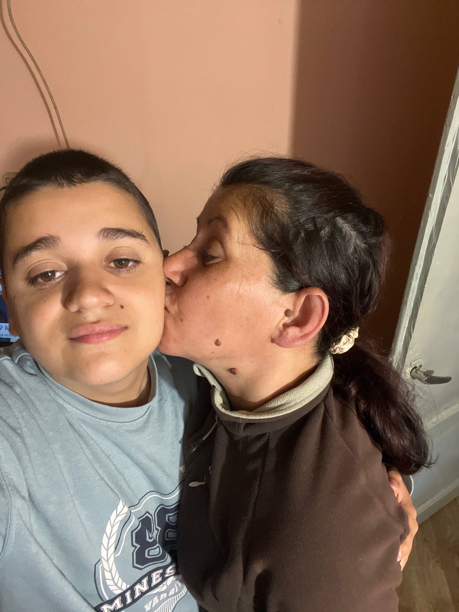 The image shows two individuals. One person with dark hair is kissing the forehead of another person wearing a blue t-shirt. The room has peach-colored walls. The location is Lozarevo, Bulgaria.