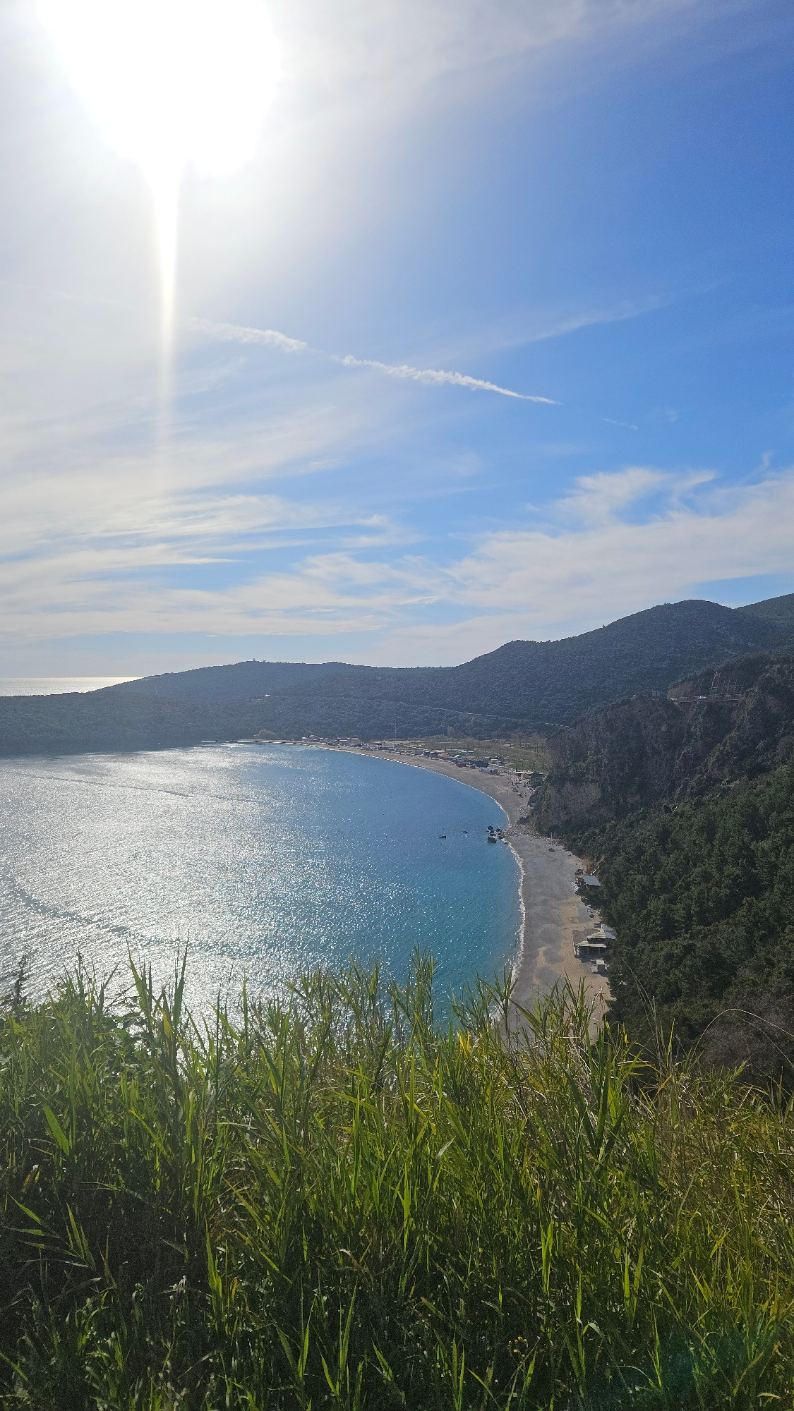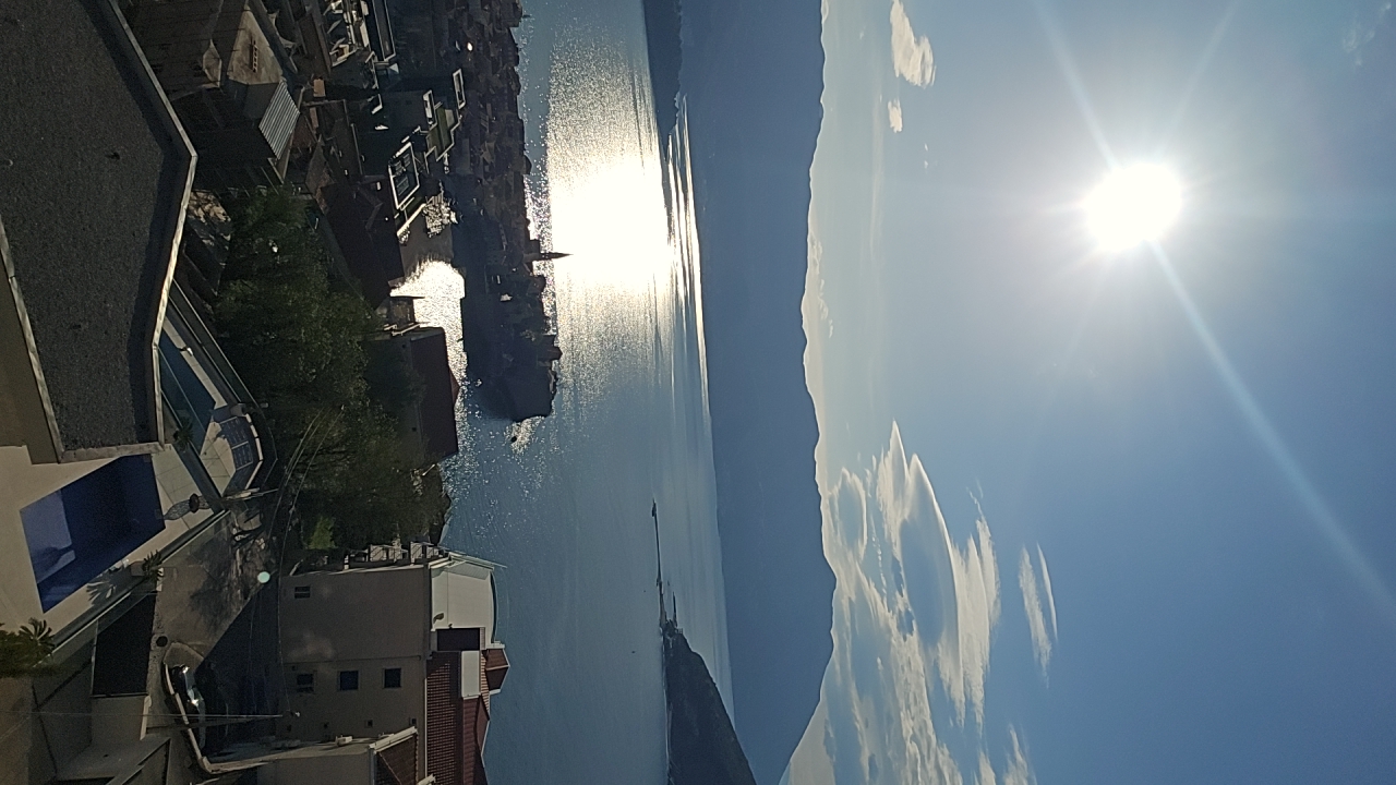 The image is an angled landscape photograph depicting a coastline along the Adriatic Sea, possibly in the vicinity of Prijevor, Montenegro. It shows a mountain range that meets the sea, featuring a sm…read more