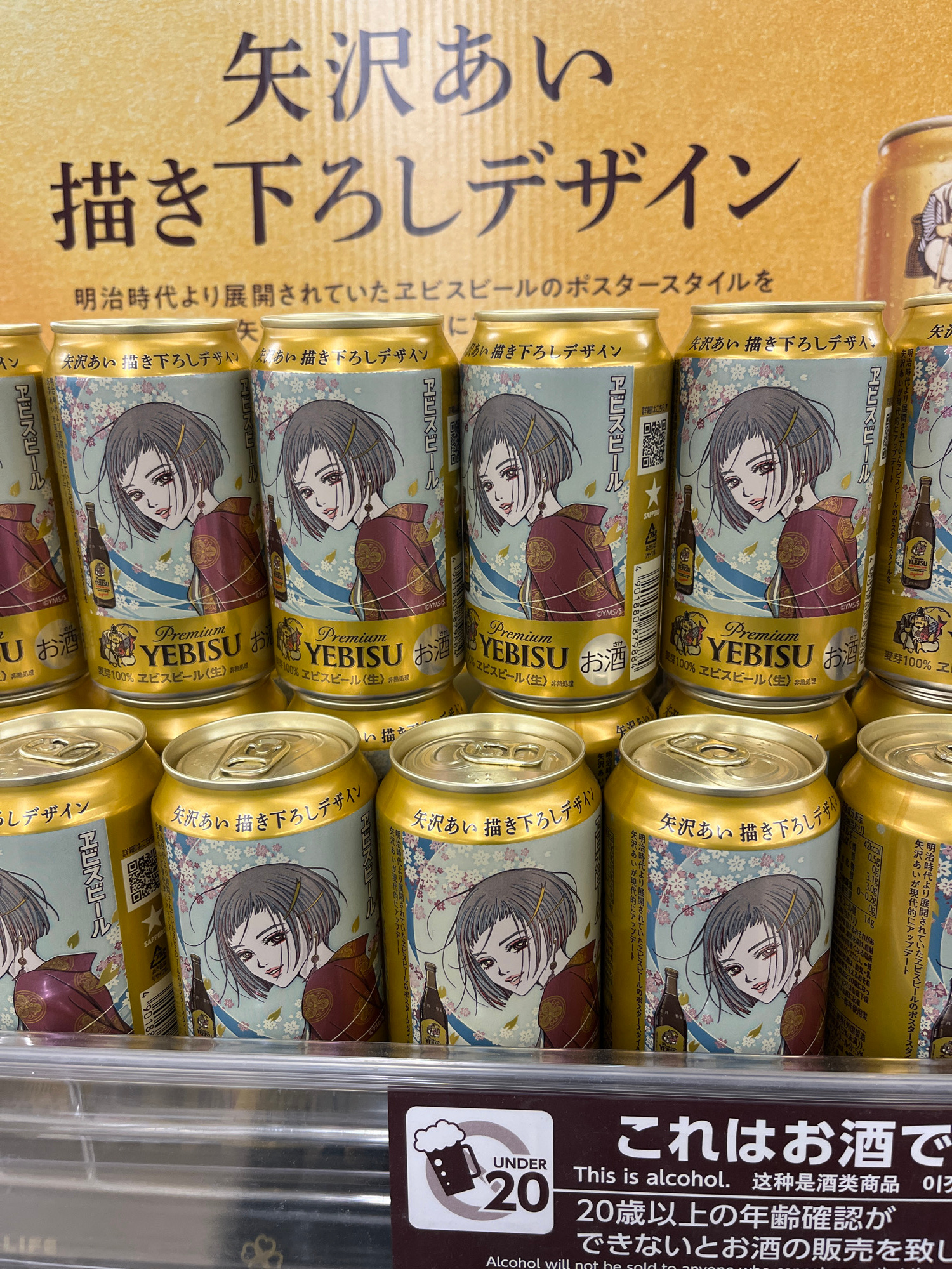 The image shows a close-up of several cans of "Premium YEBISU" beer with a unique manga-style design. The cans feature a female character illustrated by manga artist Ai Yazawa. They are arranged in ro…read more