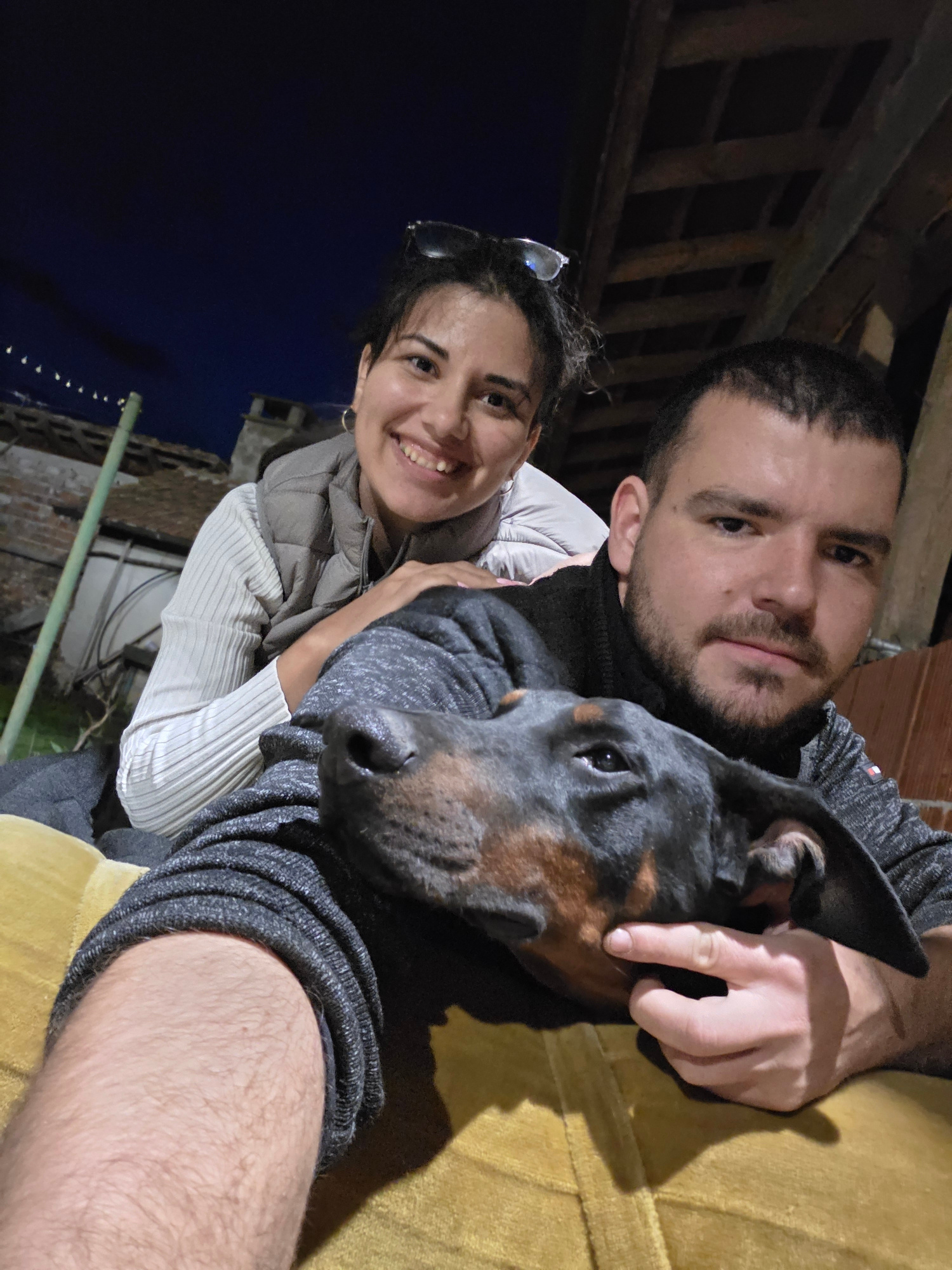 A selfie-style photograph taken at night depicts two adults and a Doberman Pinscher. A female subject, identifiable as an adult with dark hair, glasses on her head, a light-colored ribbed long-sleeved…read more