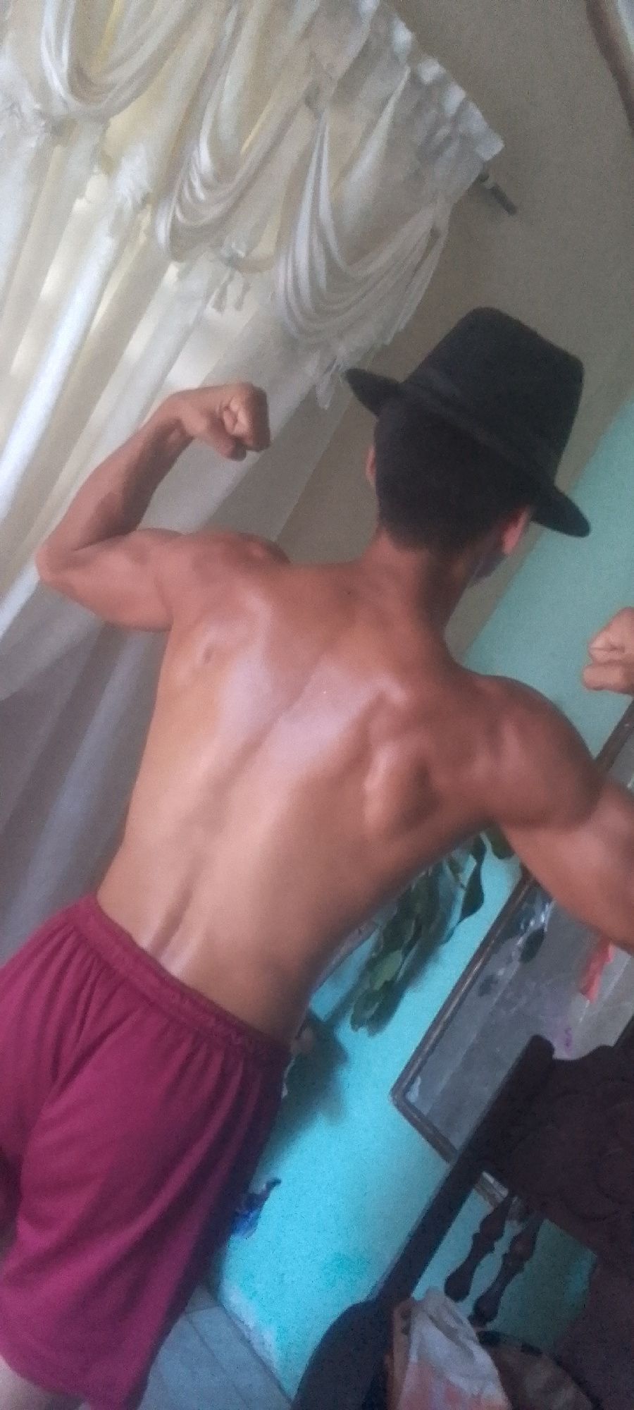 A person is seen from the rear, flexing both arms to display their biceps and back muscles. They are wearing maroon shorts and a black fedora hat. The backdrop consists of white curtains, a teal-color…read more